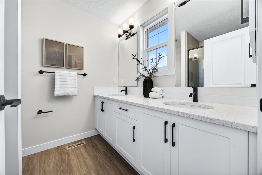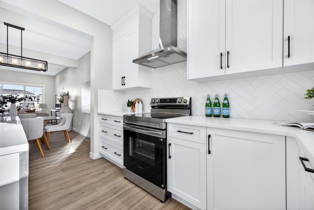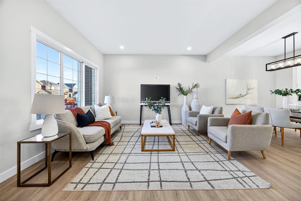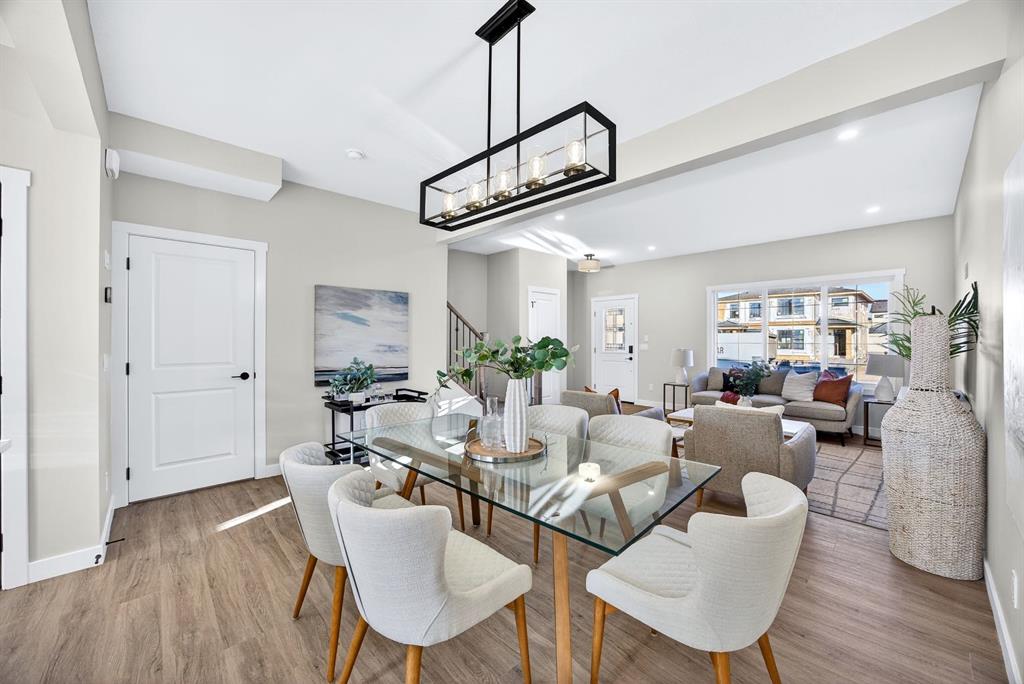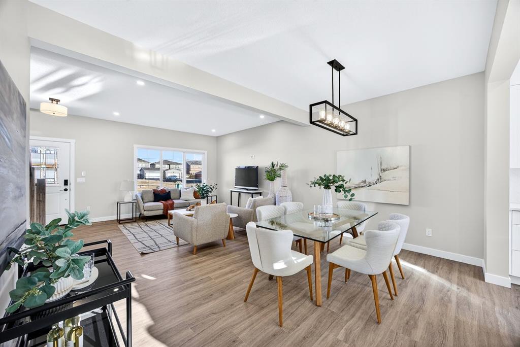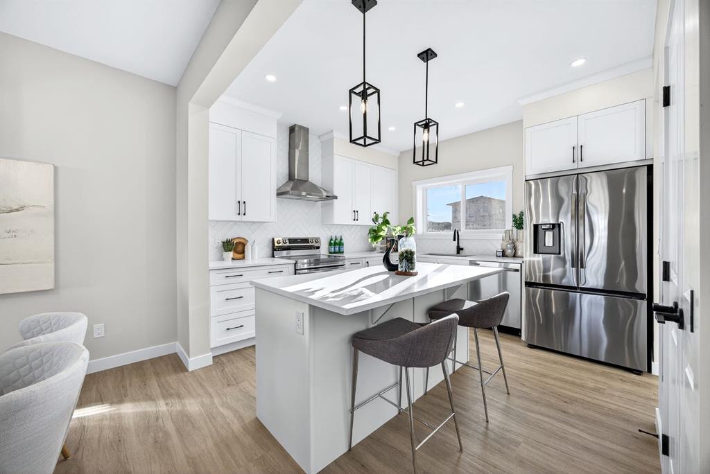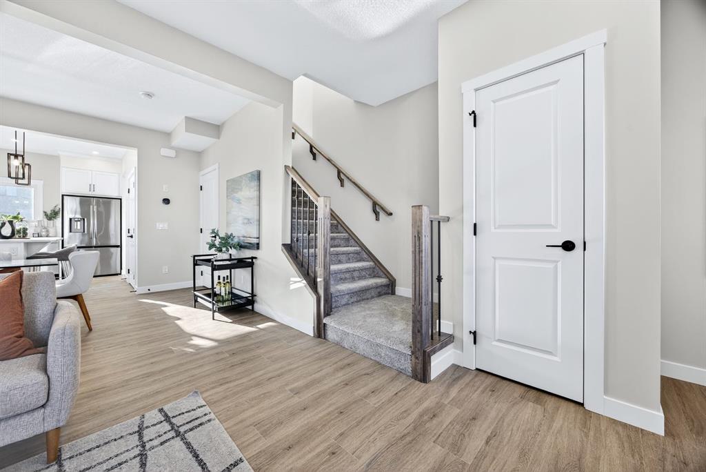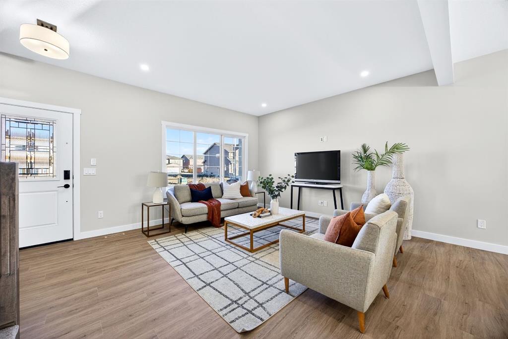 Welcome to this stunning, brand-new Genesis Builders duplex. The “Oscar” offers modern design, functional living, and exceptional future potential with basement suite rough-ins “legal suite subject to approval and permitting by the city/municipality”, all complemented by a warm, inviting colour palette that creates a welcoming atmosphere throughout the home. Featuring 3 bedrooms and 2.5 bathrooms, this home is thoughtfully crafted and offers over 1400 sq ft. The main floor showcases a bright, sun-filled floorplan with 9′ ceilings and a seamless open-concept layout, connecting the spacious living room, central dining area, and stylish kitchen. The kitchen is beautifully appointed with quartz countertops, two-toned cabinetry, a large central island, and a sleek stainless steel appliance package, complete with a gas line to the range. A convenient powder room completes the main level. Upstairs, the primary suite is a private retreat featuring a generous walk-in closet and a spa-inspired ensuite with his-and-hers sinks and an oversized shower. Two additional well-sized bedrooms, a full bathroom, and convenient upper-floor laundry complete the second level. The unfinished basement offers incredible flexibility with 9′ ceilings, a separate SIDE ENTRANCE, and BASEMENT SUITE ROUGH INs, making it ideal for additional living space or future income potential. Outside, the backyard is a blank canvas, ready for your personal touch and offering the opportunity to build your dream garage. Located in the vibrant and family-friendly community of Fireside, this home offers the perfect balance of small-town charm and modern convenience. Fireside is known for its extensive pathway system, parks, playgrounds, and green spaces, ideal for walking, biking, and outdoor enjoyment. Residents love the easy access to schools, shops, restaurants, and everyday amenities, all just minutes away. With quick access to Highway 22 and Highway 1, commuting to Calgary or heading west to the mountains is effortless. *Taxes have not been assessed. Photos are representative of the same model. This property’s colour palette is included in the pictures. RMS has been applied to the builder’s construction drawings.
