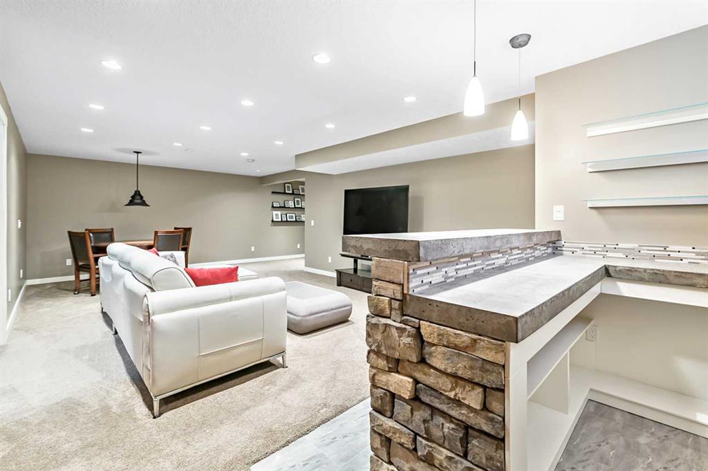 Welcome to this beautifully maintained two-storey home offering the perfect blend of space, comfort, and functionality in a highly desirable location. A dramatic vaulted ceiling entrance and gleaming hardwood floors create an impressive first impression the moment you step inside. The bright and inviting main floor features a spacious living room with a large window and cozy gas-burning fireplace, filling the home with natural light and warmth. The open-concept kitchen is designed for both everyday living and entertaining, complete with stainless steel appliances, gas stove, central island, and a convenient walk-through pantry leading directly to the mudroom/laundry area. The generous dining room, surrounded by additional windows, provides plenty of space for family meals and gatherings while allowing sunlight to pour throughout the home. Upstairs you’ll find a versatile loft with custom built-ins, ideal for a home office, study area, or reading nook. The upper level also features three generously sized bedrooms, including a spacious primary suite with a walk-in closet and a luxurious 5-piece spa-inspired ensuite designed for relaxation. The fully finished basement expands the living space with a huge family room, bar area, fitness room, storage room, and rough-in plumbing for a future bathroom, offering excellent flexibility for growing families. Step outside to enjoy the fully landscaped backyard featuring a mature tree, oversized deck with gas BBQ line, and storage shed, perfect for entertaining or relaxing outdoors. Note: Central air conditioning and a double oversized attached garage with loft storage provide added comfort and convenience. Ideally located within walking distance to schools, playgrounds, shopping, public transit, and Fish Creek Park. This home shows extremely well with pride of ownership!