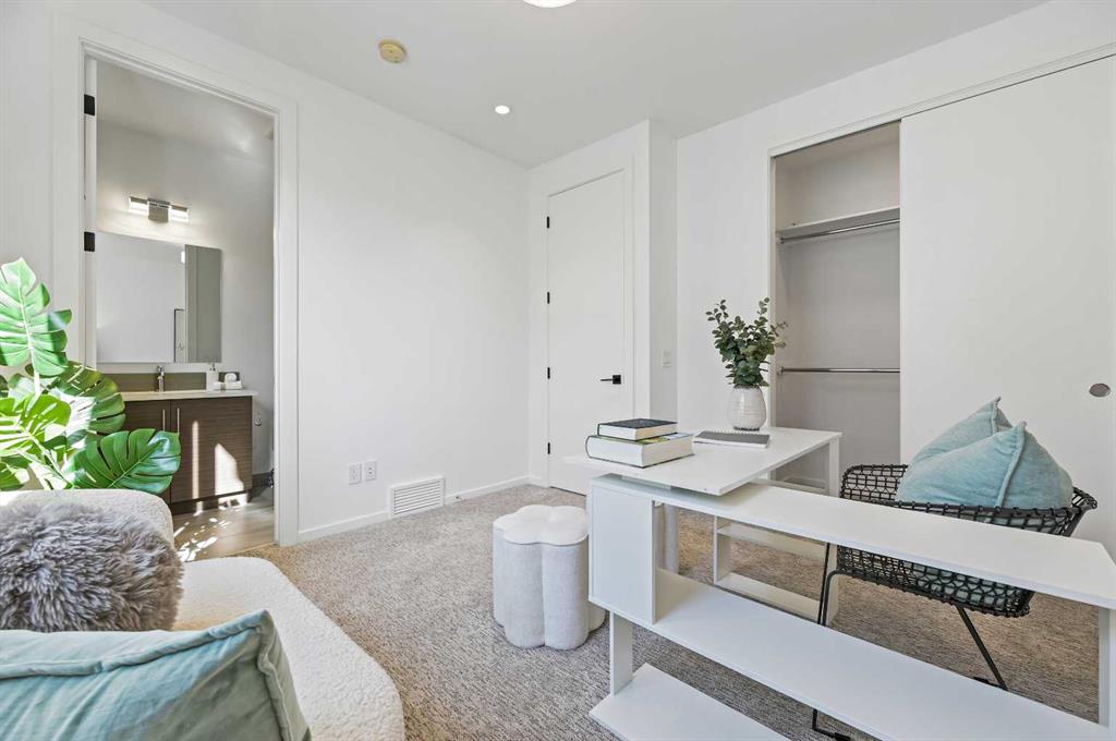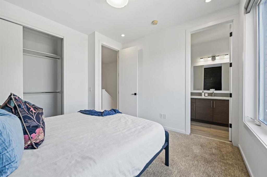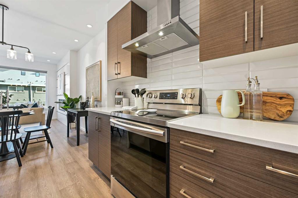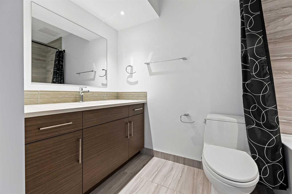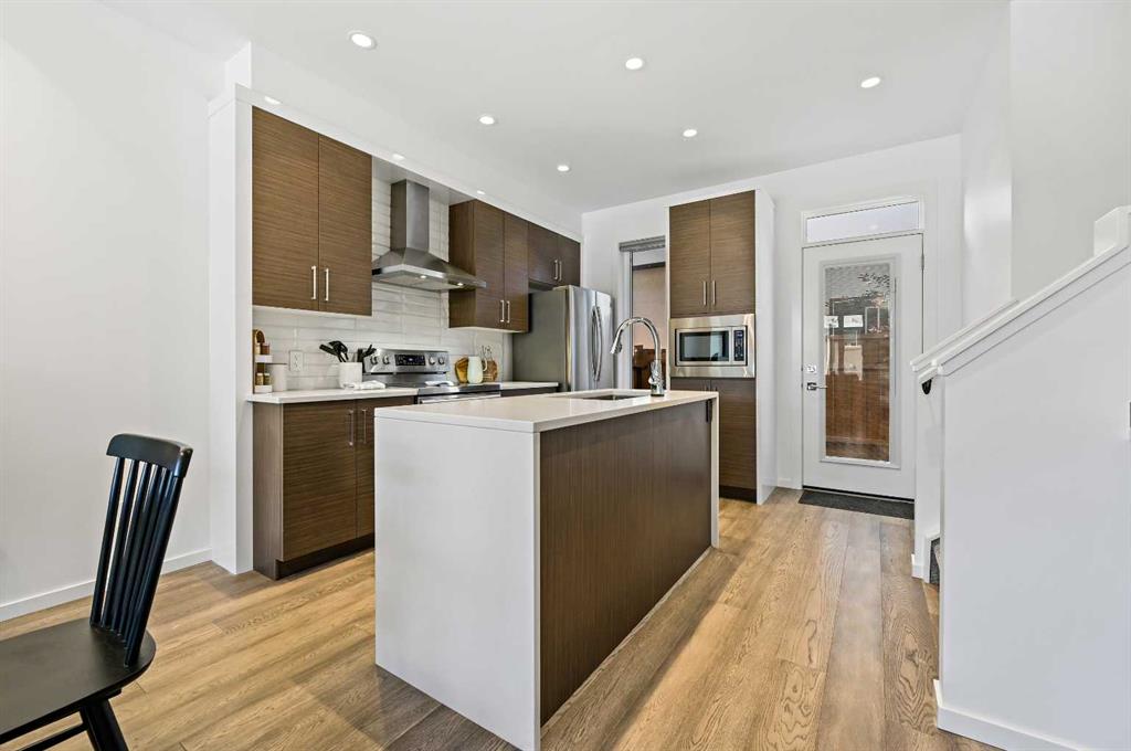 ATTENTION INVESTORS/PROFESSIONALS/DOG OWNERS/UPGRADERS/FIRST TIME HOME BUYERS – Stylish. Spacious. Sophisticated. TURN KEY & MOVE IN READY… This exceptionally well-appointed 3-bedroom, 3.5-bath townhome offers over 1,600 sq ft of thoughtfully designed living space in one of Calgary’s most desirable inner-city communities. Each bedroom features its own private ensuite, providing a perfect blend of luxury and convenience for families, professionals, or guests. A bonus powder room on the main level adds everyday functionality. From the moment you step inside, the open-concept layout, soaring 9’ flat ceilings, and oversized interior doors create a sense of airiness and modern elegance. The modern kitchen features sleek modern cabinetry, waterfall quartz countertops, white oak engineered hardwood flooring, stainless steel appliances, and a glossy tile backsplash.