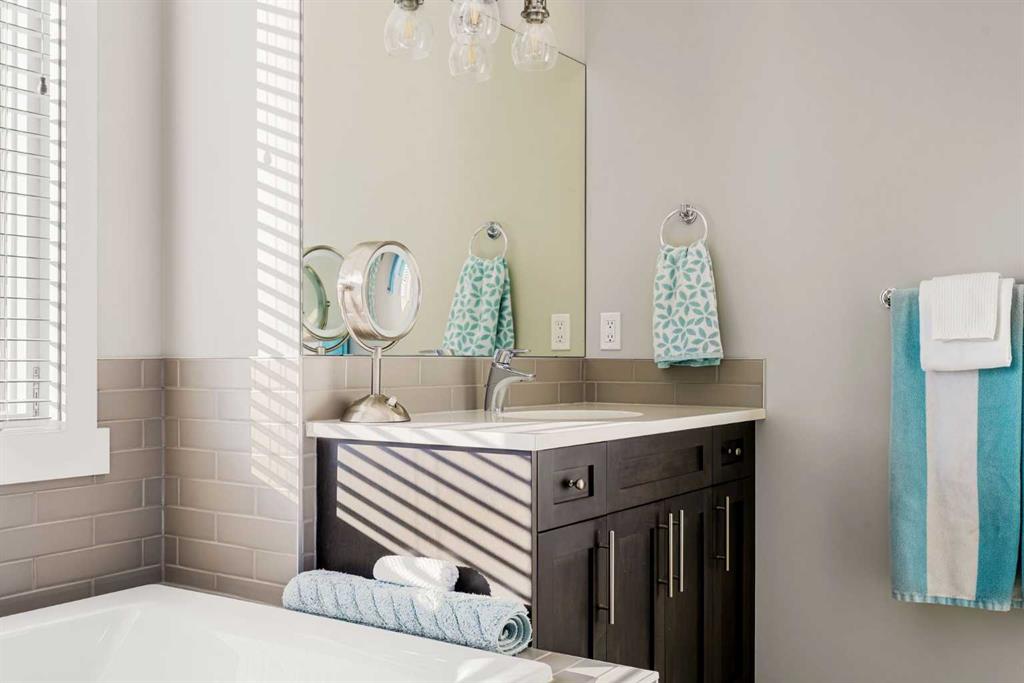 The Walk Out Basement has been professionally developed with permit and is an absolute delight. The family room features large, wetland-facing windows and a beautiful fireplace that would be right at home in a Banff lodge. A custom Oak Wetbar features an exotic leathered granite counter and a perfect space for a work out corner or card table that steps out onto the covered lower patio, which features a second gas line connection. The basement also includes a large guest room and a stunning, top-of-the-line washroom with a fully tiled bath surround a nice deep tub, a quartz ledge, and a stunning custom vanity cabinet.