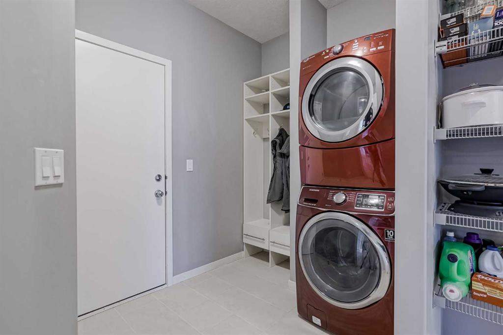 The living room is bathed in natural light thanks to large windows, and features a sleek modern fireplace that creates a cozy yet elegant vibe. A main-floor mudroom with custom lockers and laundry area provides function without sacrificing style, ideal for busy households.