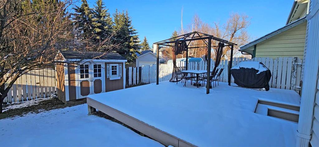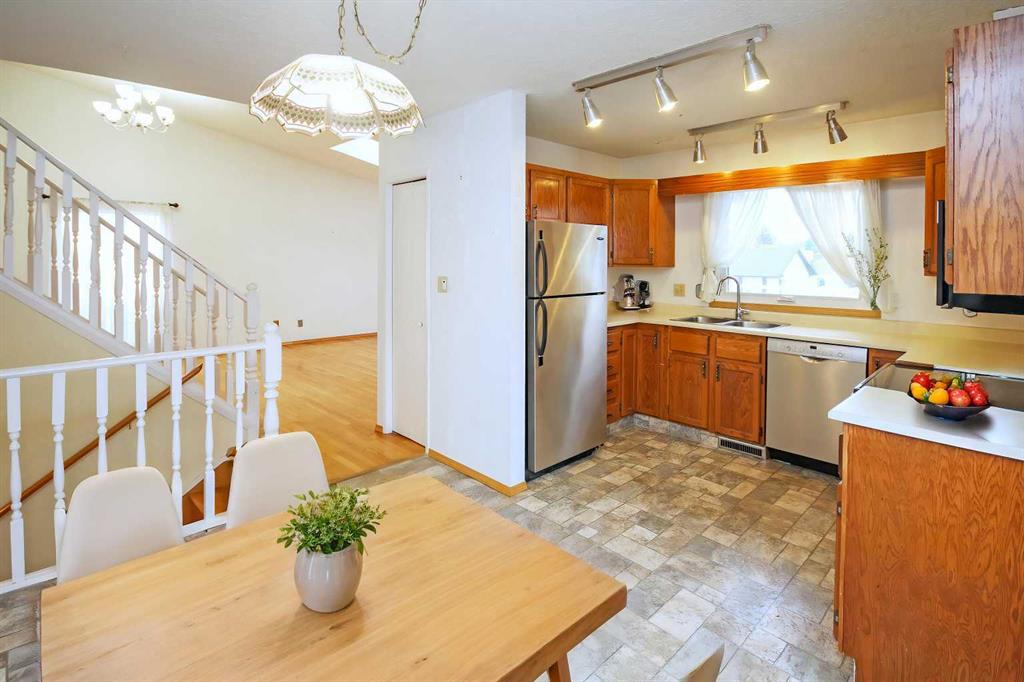 Welcome to this well maintained 4 level split home with over 1980 sq ft of living space. Upon entry, the open concept main level showcases beautiful hardwood floors in the living and dining room with vaulted ceiling that add to the grandeur and an abundance of windows and skylight allowing lots of natural light. A spacious kitchen with a second eating area has patio doors leading you out to a big front and side decks that are great for BBQing and entertaining. The hardwood continues upstairs down the hallway and into the 3 spacious bedrooms. The master bedroom has a 4 piece ensuite and another 4 piece bathroom on the upper level. On the 3rd level gather in the family room in front of the gas fireplace for game night or dancing on the corner dance floor. This level is also home to another room for your home office/play area/recreation space or guest room with a 2 piece washroom and sink area. This room gives you easy access to the back deck and yard. Fully fenced backyard has lots of room to play and relax whether lounging or entertaining on the deck or playing in the yard. The fourth lower level is developed with another room with 2 large south facing windows great for a home office. There’s laundry area and access to the attached garage on this level. As well as a huge crawl space for storage. Upgrades include: furnace (2008), windows (2014), metal roof 50 yr warranty (2008), R50 insulation (2012), deck (2009), poly-b removed (2010), fireplace gas insert (2008), skylight (2014), leaf guards (2023). Woodbine is a great community with great schools. Easy access to Stoney Tr, Fish Creek Park, Costco and close to local amenities and schools, a great place to call home!