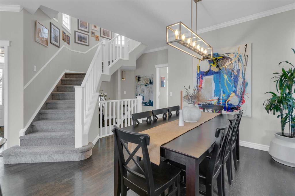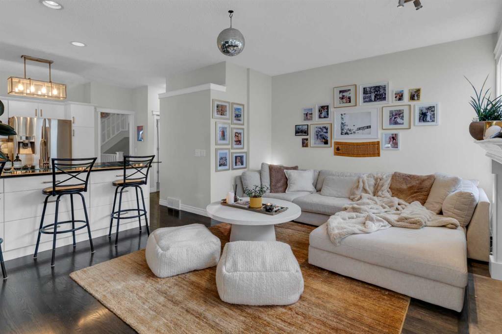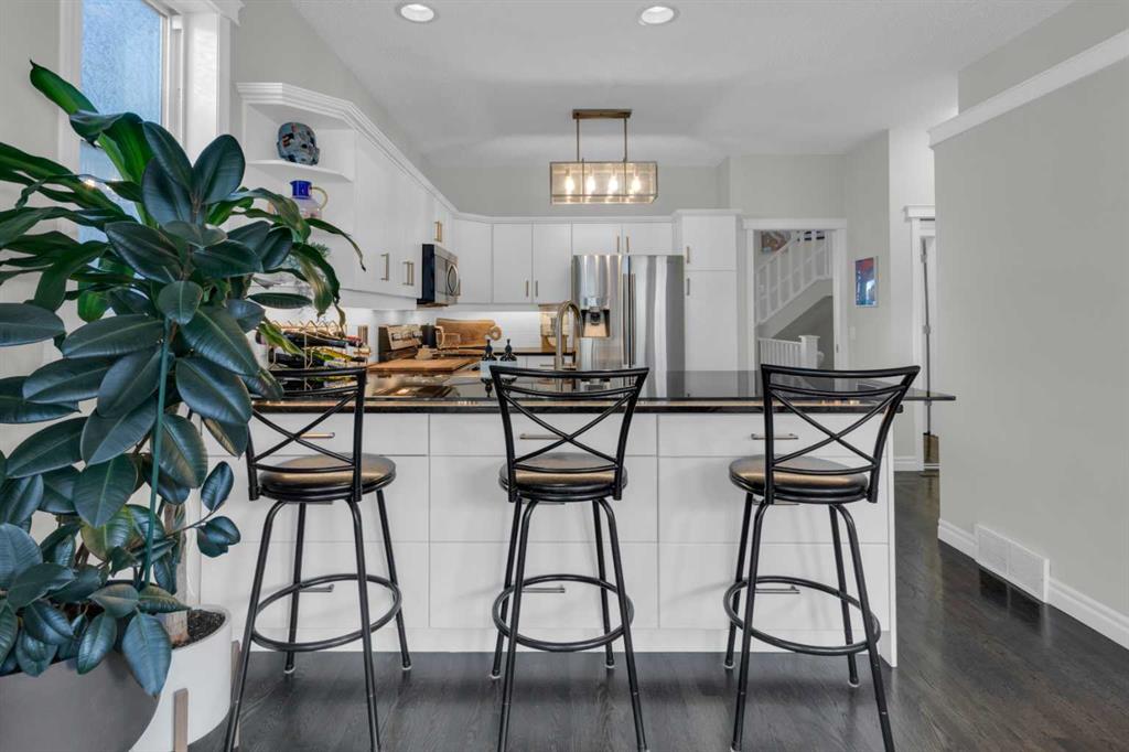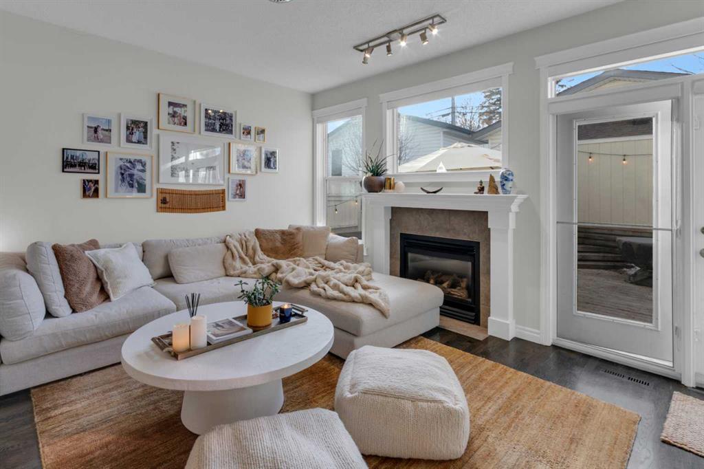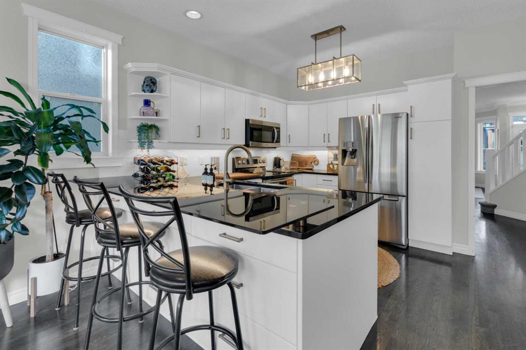 Walking up to the house you’ll find a durable composite inviting porch where you can sip your morning coffee, or see view of downtown in the distance and watch the Calgary Stampede, Canada Day and New Year’s Eve annual fireworks at night. This unique inner core home is just a 10 minute drive from downtown, 5 minute walk from restaurants and more on 4th street, and a 5 minute walk just two blocks up to a gorgeous ridge with pathways with Elbow river access overlooking Stanley park. Also in walking distance is the off leash Roxboro dog park.Once stepping inside the home, you are greeted by an open-concept living and dining area featuring soaring 9 ft ceilings, elegant crown moldings, and site-finished oak hardwood floors. The timeless chef’s kitchen is a focal point, finished with premium granite countertops, stainless steel appliances and a new Bosch dishwasher. In the kitchen you’ll find a custom eating bar perfect for morning coffee or evening entertaining. Underneath the custom bar are six large drawers perfect for concealed but stylish storage. All kitchen handles on cabinets and drawers are new, elevating gold additions from Banbury Lane. Relax in the adjacent family room with a wall of large, bright windows anchored by a cozy fireplace for those chilly Calgary nights.