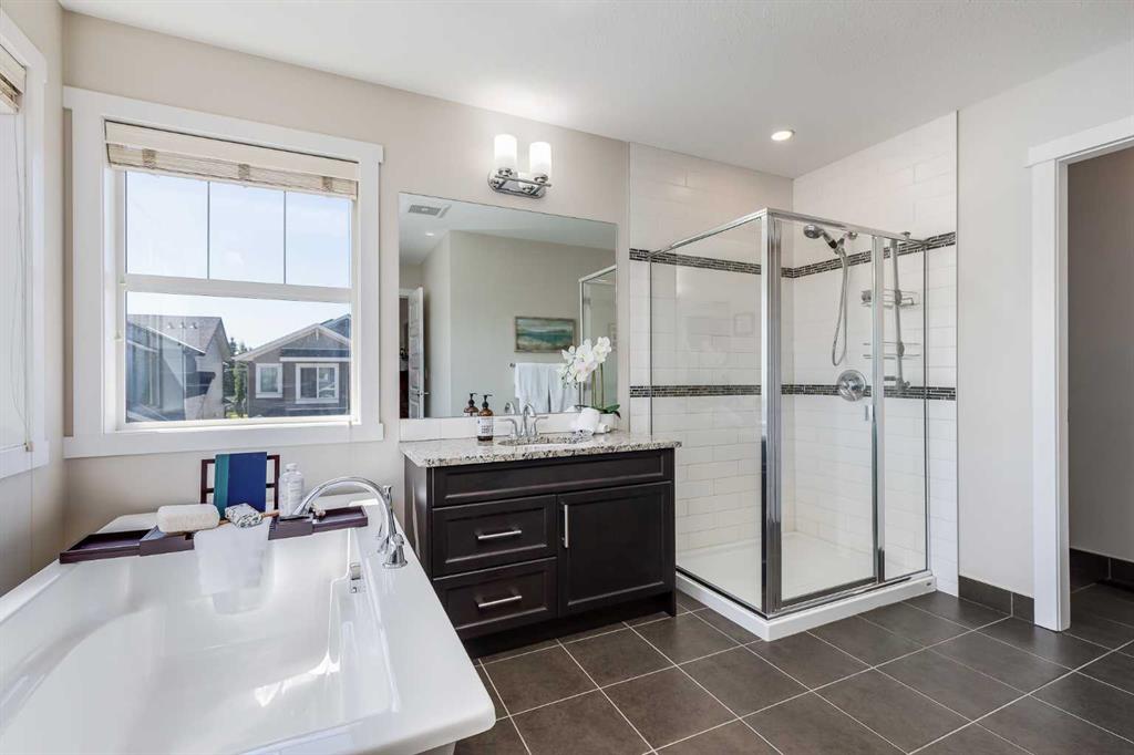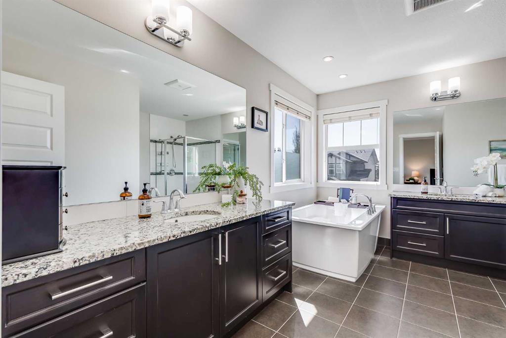 Upstairs, you’ll find a vaulted bonus room that makes a great play area or secondary family room, plus three spacious secondary bedrooms, a full four-piece bathroom, and a convenient upper laundry room with additional storage. The primary retreat is a standout, with vaulted ceilings, a built-in window bench, walk-in closet, and a spa-like five-piece ensuite featuring a tiled shower, deep soaker tub, dual sinks, and plenty of natural light.