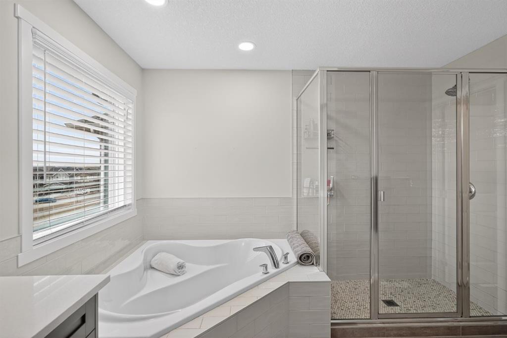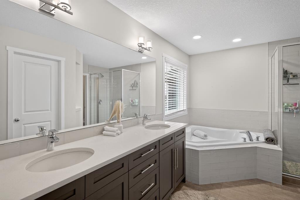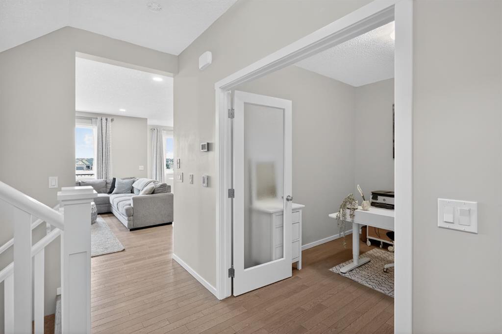 A main floor office with French doors creates a dedicated workspace, while upstairs, the bonus room provides additional living space. The primary suite is a true retreat, featuring a beautifully appointed 5-piece ensuite with a soaker tub and separate shower. Two additional generously sized bedrooms, both with walk-in closets, along with upper-floor laundry, complete the level.