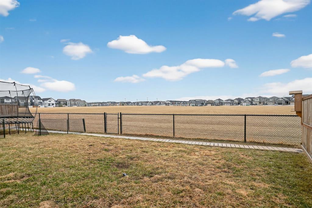 The landscaped and fenced backyard opens directly onto wide green space with uninterrupted views and access to nearby pathways.