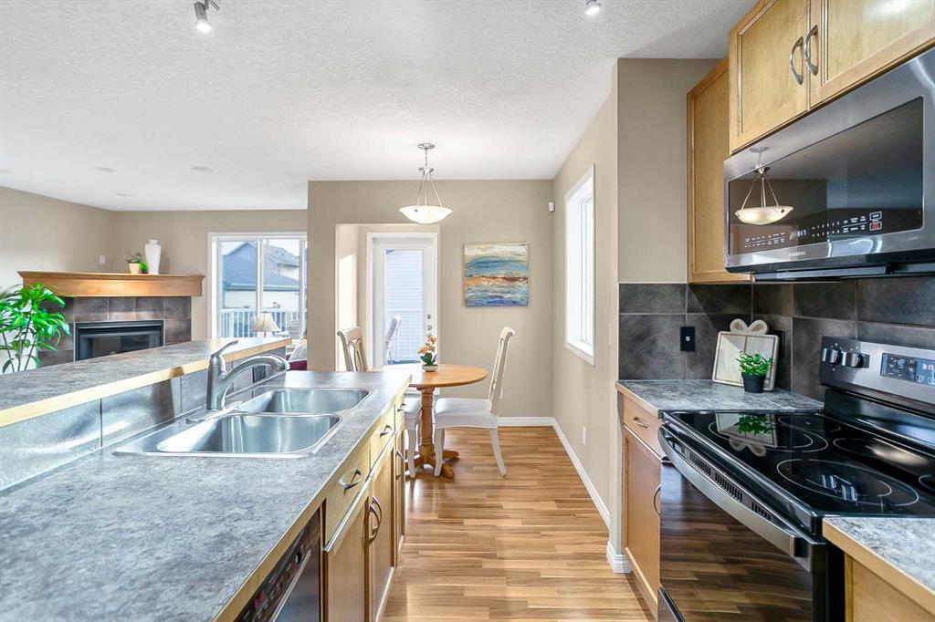 Looking for a home where all the big-ticket items are already done? Look no further. Meticulously maintained by the original owners, this home and garage have seen extensive upgrades within the last five years, including new shingles, siding, eavestroughs, downspouts, furnace, central AC, hot water tank, and the majority of the appliances. The entire home has also been freshly repainted, making it truly move-in ready. The main floor offers a private front office, while the remainder of the layout is bright and open. The kitchen features a brand-new refrigerator, newer sleek black stainless steel appliances, an island with an eating bar, and a pantry. The dining area is filled with natural light, and the living room is anchored by a cozy corner gas fireplace and has built-in speakers. Upstairs, you’ll find three spacious bedrooms and a full 4-piece guest bathroom with a linen closet. The primary retreat easily accommodates king-sized furniture and includes a walk-in closet and a 3-piece ensuite. The fully finished basement adds even more living space with a family room featuring a second gas fireplace, a games area, a 4-piece bathroom, a fourth bedroom, and laundry. Enjoy the sunny, south-facing backyard complete with full fencing and a large deck that is perfect for entertaining. Custom Gemstone lighting enhances the exterior, creating a welcoming first impression day or night. The double detached garage provides ample space for parking and storage. Out front, a charming covered porch overlooks the Complexe Scolaire Francophone de Silverado School. Ideally located on a quiet street and within walking distance to green spaces, walking paths, and all amenities. This home offers comfort, convenience, and peace of mind.
