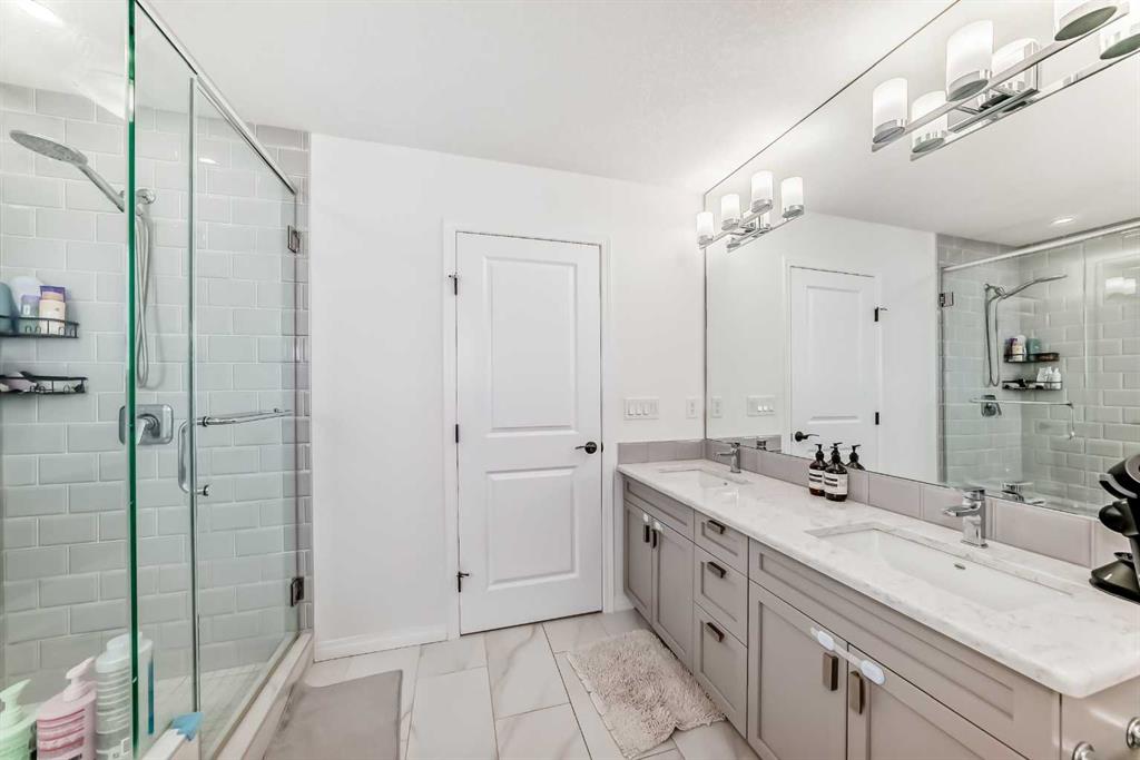 Upstairs, the spacious primary suite offers a walk-in closet and a private 5-piece ensuite with dual sinks, a soaker tub, and separate shower. Two additional bedrooms, a 4-piece bathroom with dual sinks, and upper-level laundry provide practical family living.