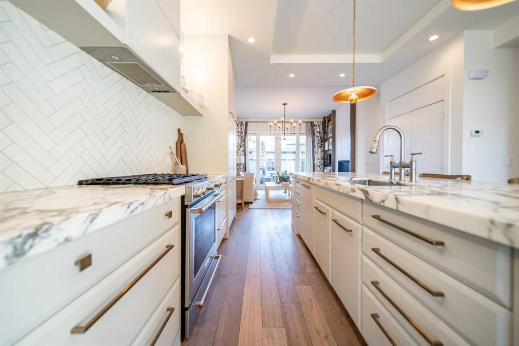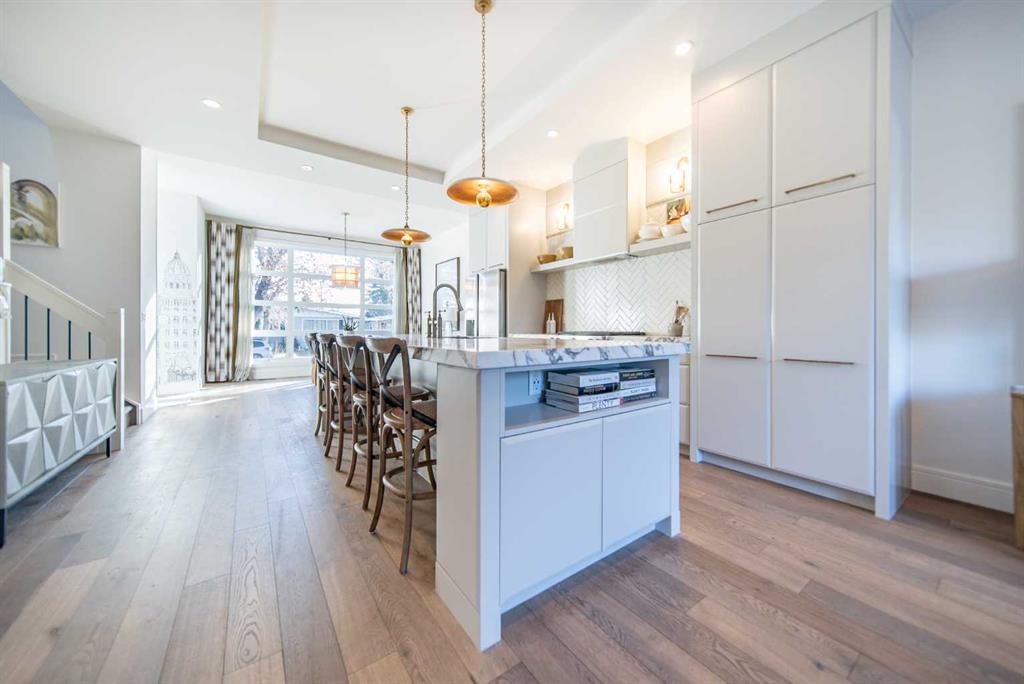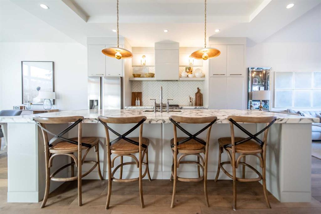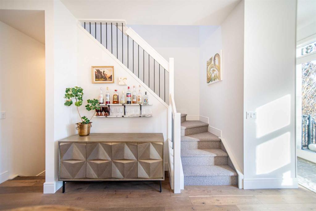 Discover this beautifully curated semi-detached home in the vibrant community of Glenbrook. Offering more than 2,500 sq. ft. of thoughtfully designed living space, this 4 bedroom, 3.5 bathroom residence combines modern elegance with everyday functionality. The main floor showcases an open-concept layout centered around a showstopping honed Arabescato Marble island, complemented by custom Rockpoint cabinetry and premium appliances a dream setup for both entertainers and home chefs. Wide plank Oiled Oak engineered hardwood flows throughout the main and upper levels, while wool carpeting on the stairs adds warmth and sophistication. In the living room, built-in shelving and a gas fireplace create a welcoming focal point, while French sliding doors extend the space to a private west-facing backyard with a deck and stone patio ideal for hosting sunset gatherings. Upstairs, the primary suite is a true retreat with a spa-inspired ensuite featuring heated floors, a freestanding soaker tub, glass enclosed shower, dual vanity, and custom cabinetry. Two additional bedrooms, a functional laundry room and a full bath complete the upper level. The fully finished basement offers even more living space with a sleek wet bar, a large rec room with hidden storage cleverly tucked behind a secret door, plus a guest bedroom with a cheater ensuite. Rounding out this home is an insulated, and heated double detached garage with rough-in for EV charging. Perfectly positioned near parks, schools, and everyday conveniences, this property delivers upscale living in one of Calgary’s most desirable neighbourhoods.