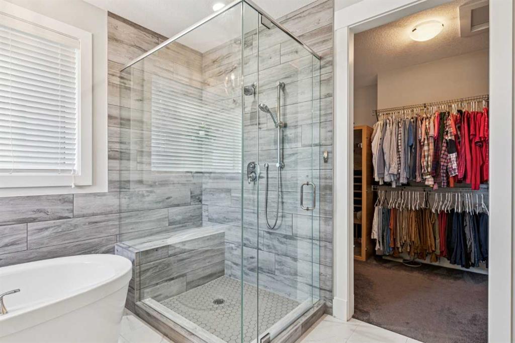 Upstairs, the primary bedroom includes vaulted ceilings and an ensuite with heated floors, soaker tub, glass shower, and walk-in closet with private sauna.