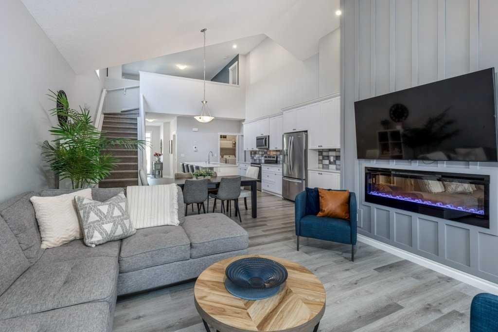 The elegant white kitchen showcases quartz countertops, ample cabinetry, a large flat island, stainless steel appliances, and a walk-in pantry, making it ideal for both everyday living and entertaining. Soaring vaulted ceilings carry through the open-concept kitchen, dining, and living areas, where the electric fireplace is framed by a stunning floor-to-ceiling feature wall with paneled millwork, creating a warm and sophisticated focal point. Luxury Vinyl Plank flooring flows throughout the main level, with cozy carpet in the primary bedroom and upper floor.