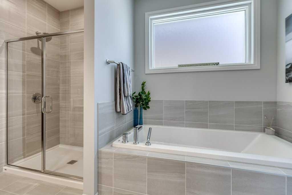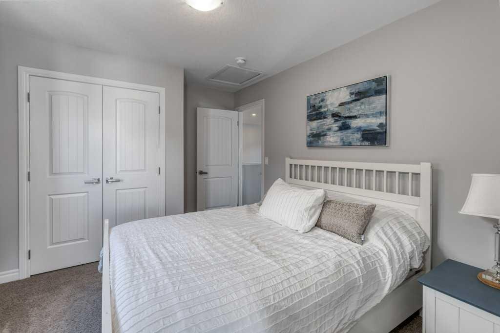 The primary bedroom is a true retreat, featuring beautiful vaulted ceilings, large windows, and an abundance of natural light. A custom barn door leads to the spa-inspired ensuite, complete with quartz countertops, double vanity, separate shower, and a deep soaker tub.