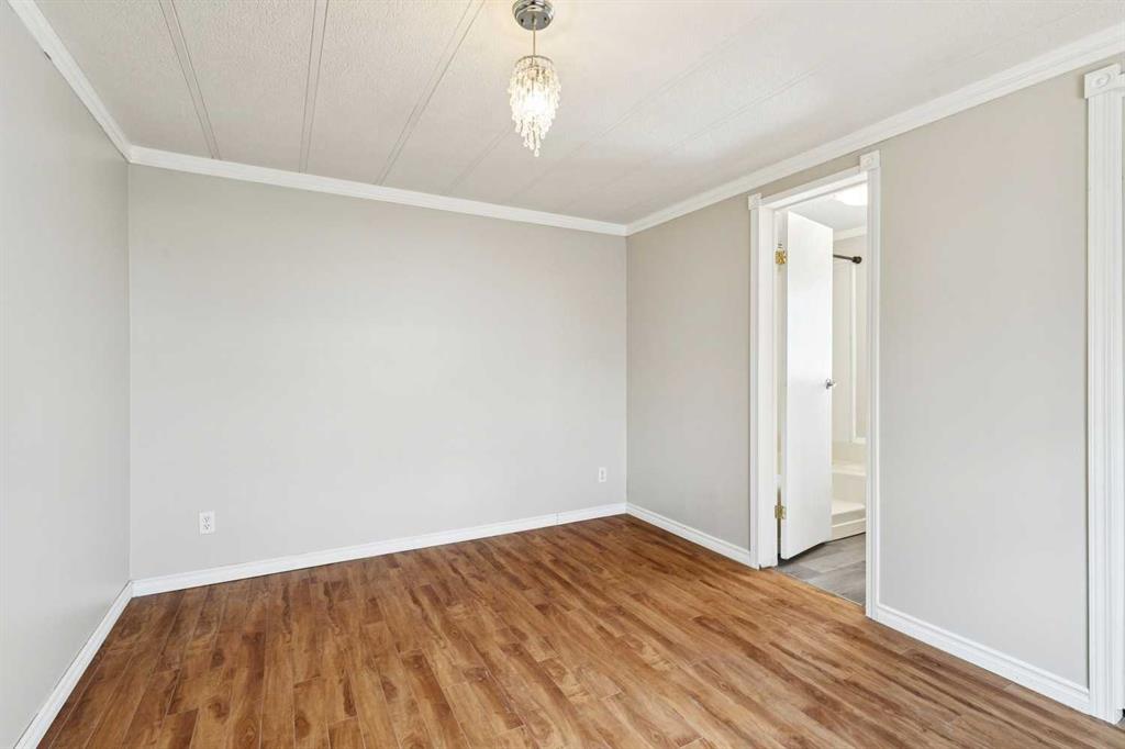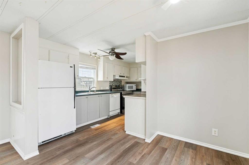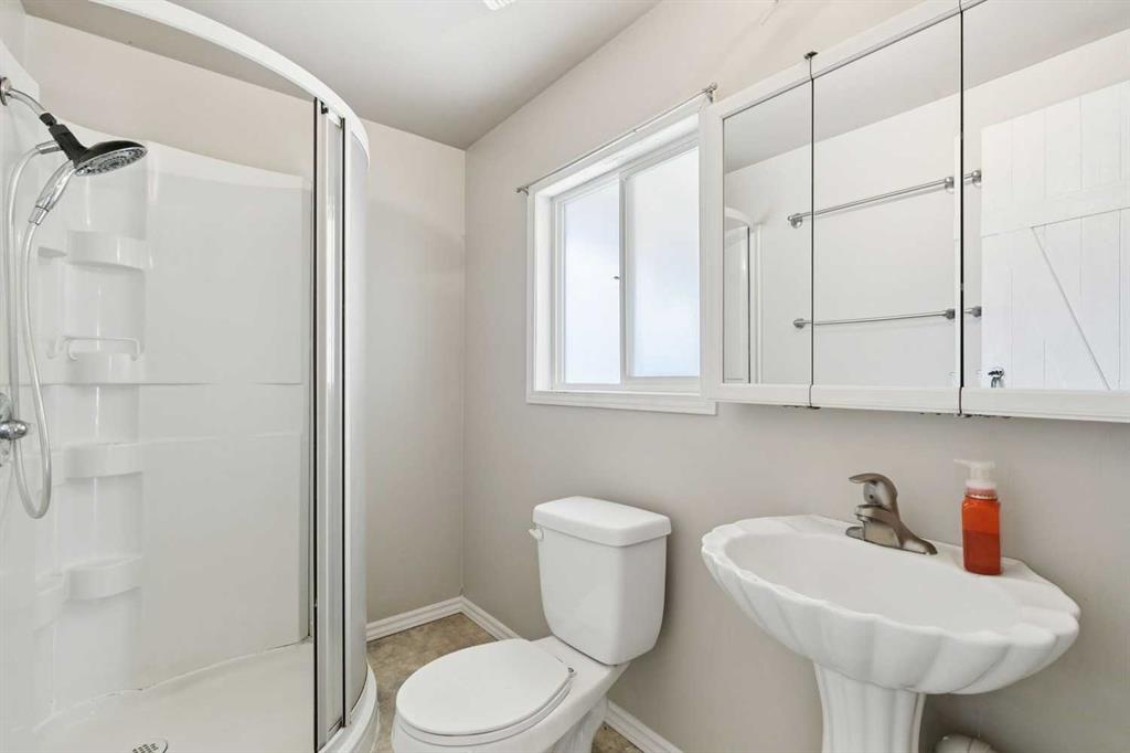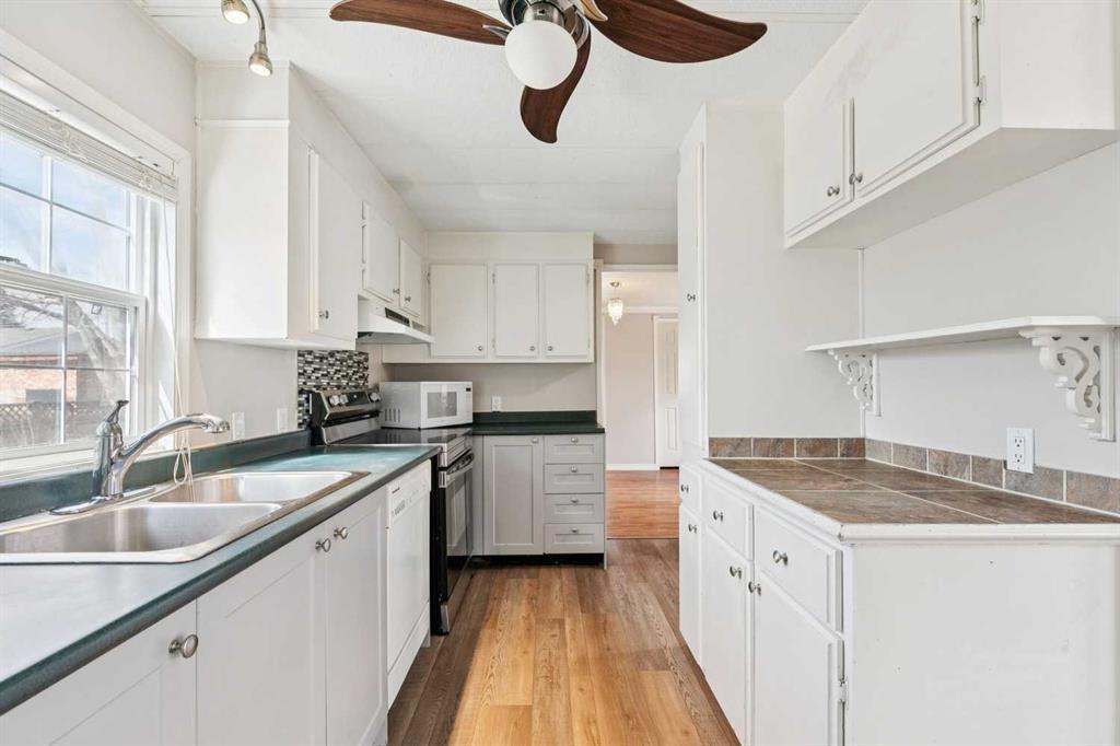 UPDATED KITCHEN, FLOORING & ENSUITE MAKE THIS MOVE-IN READY GEM A MUST-SEE! Welcome to this charming home tucked away on a quiet street, offering a perfect blend of comfort, functionality, and outdoor space. Step inside to a bright, open-concept layout where the kitchen seamlessly connects to a spacious living room with large windows that flood the space with natural light. The adjoining dining area creates an ideal setup for everyday living and entertaining. The main level features a generous primary bedroom with a refreshed ensuite (toilet, vanity, and flooring replaced in 2022) and easy access to the laundry room for added convenience. Two additional bedrooms, a full bathroom, and main floor laundry complete the level. Recent upgrades add real value, including fresh paint throughout, new lower kitchen cabinetry (2024), updated main area flooring (2024), and a newer stove (2023). Step outside through double doors to a large deck overlooking a private, tree-lined backyard. Fully fenced and beautifully maintained, this outdoor space also offers RV parking, perfect for added flexibility. Located in a quiet, established neighbourhood close to the Airdrie Rec Center, parks, pathways, and everyday amenities, this home is an excellent opportunity for first-time buyers, investors, or anyone looking for a well-rounded property in a great location. SOME PHOTOS ARE VIRTUALLY STAGED.