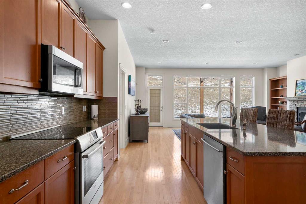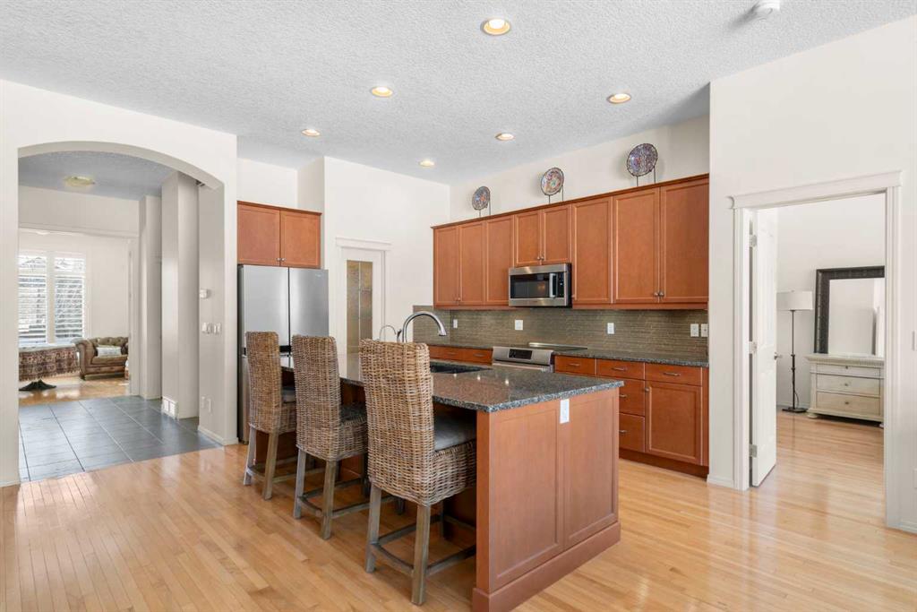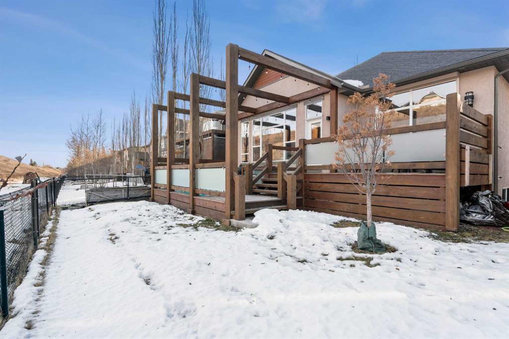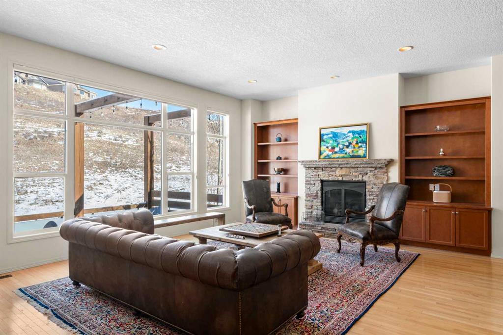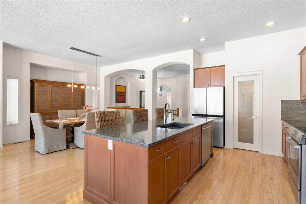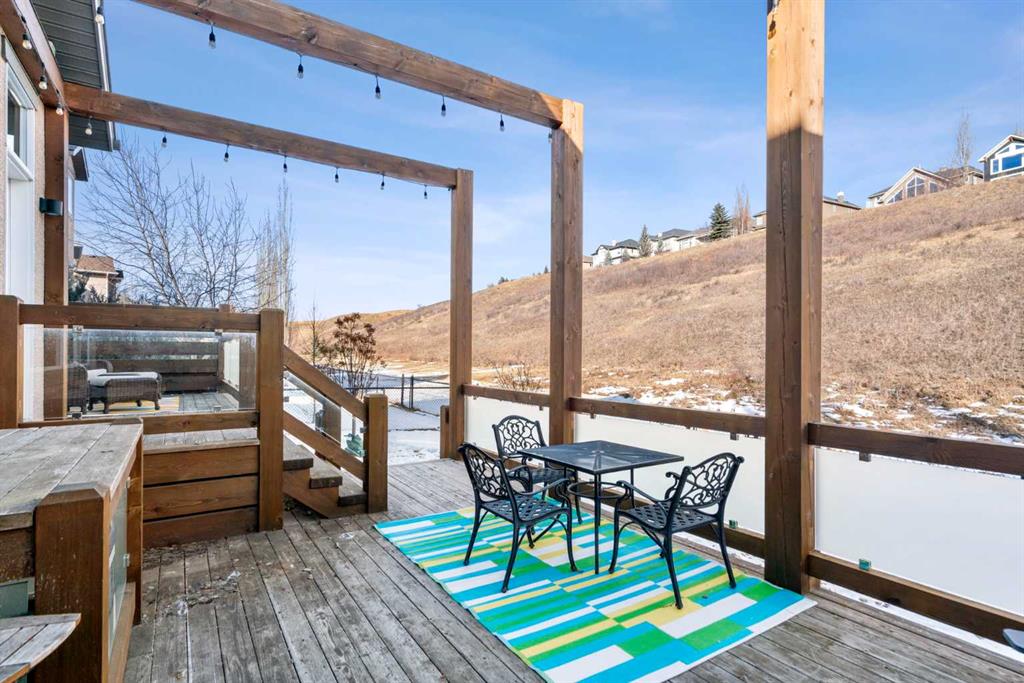 Experience the perfect blend of luxury, privacy, and family friendly design in this stunning Discovery Ridge bungalow, ideally situated at the quiet end of the boulevard, backing directly onto tranquil green space, steps to Griffith Woods Park. This Morrison built home offers nearly 3,460 sq ft of thoughtfully crafted living space, with soaring 10 foot ceilings, rich hardwood and ceramic tile floors, and expansive windows that flood the interior with natural light while framing serene views of prairie grasses and lush landscaping. The open concept main floor is anchored by a warm fireplace surrounded with built-ins. Featuring a versatile front room perfect as a formal dining area or home office with double French doors including bevelled glasss. The chef inspired kitchen dazzles with granite countertops, a massive central island with breakfast bar, premium stainless steel appliances, a walk-in pantry, subway tile backsplash, and a sunny breakfast nook that flows effortlessly to a large private deck with BBQ gas hookup for entertaining. Practical family living is enhanced with a mudroom and main floor laundry connecting to the oversized double garage – the front driveway is extra wide, easily accommodating a third car width. The primary retreat is a true sanctuary with a spacious layout, walk-in closet, and spa-inspired 5-piece ensuite featuring dual vanities, soaker tub, and separate shower. Additional main-floor living spaces include a 2 piece powder room, massive family room and open dining area with hutch cutout., and the front den. The fully developed basement expands the home’s versatility with a massive recreation room, wet bar with beverage fridge, cozy second fireplace, two large bedrooms, full bathroom with heated tile floors, and a flexible media or exercise room, offering space for family, guests, and entertaining. Outside, the professionally landscaped backyard backs onto a private reserve, creating a private oasis with manicured gardens, a statement pergola, and expansive tiered decks, perfect for summer gatherings or peaceful reflection. The home’s location provides the closest experience to mountain living within city limits, yet remains minutes from Signal Hill Shopping, Stoney Trail, premier golf at Elbow Springs, Pinebrook and the Glencoe G&CC, and quick and easy downtown Calgary and mountain access . Blending timeless craftsmanship, thoughtful design, and luxurious upgrades – including soaring ceilings, custom millwork, designer lighting, and seamless indoor / outdoor flow – this exceptional bungalow represents the ultimate Discovery Ridge lifestyle, offering unparalleled privacy, comfort, and elegance in one of Calgary’s most coveted west end communities, a true sanctuary where cherished memories and everyday joy await.