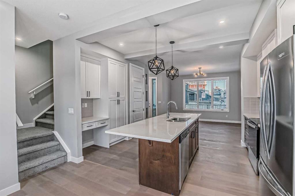 IMMEDIATE POSSESSION! BRAND NEW HOME by Douglas Homes, Master Builder in central Greystone, short walking distance to the Bow River, shopping & interconnected pathway system. Featuring the Melbourne with additional SIDE ENTRY. Located down the street from the community Kids Play Park on a sunny west facing backyard, great for entertaining. This gorgeous 3 bedroom, 2 & 1/2 half bath home offers over 1225 sq ft of living space. Loads of Designer/upgraded features in this beautiful, open floor plan. The main floor greets you with a grand glazed 8′ front door, entry closet with 8′ door, soaring 9′ ceilings, oversized windows , & 8′ 0″ passage doors. Distinctive Engineered Hardwood floors flow through the Foyer, Hall, Great Room, Kitchen & Nook adding a feeling of warmth & style. The two sided Kitchen is completed with an oversized entertainment island (9’0″ single level island) & breakfast bar, roomy cabinet pantry, Quartz Countertops, 42″ Cabinet Uppers accented by decorative drywall bulkhead, Pots & Pans Drawers, soft close doors & drawers throughout, new stainless appliance package including Microwave/Hood Fan combo over the stove , smooth top electric Range, Fridge & built-in Dishwasher. The main floor is completed with an expansive, open Great Room with Napoleon “Entice” fireplace, spacious Nook finished with over height windows, rear entry with full French Door & transom above, closet & 1/2 bath . Upstairs you’ll find a well sized Primary Bedroom with 3 piece Ensuite including separated Quartz vanity with undermounted sink & oversized 5’0″ x 3’0″ shower with tiled walls & ceramic tile flooring. There is also a generous sized walk-in closet accessed from the bedroom. There are two additional good sized bedrooms with roomy closets. The second floor is completed by a main bathroom with combination Tub/Shower with tiled walls, Quartz countertop with undermounted sink & in-vanity drawer all completed by ceramic tile flooring. You’re certain to love the convenience of the 2nd Laundry for stacked washer/dryer also completed with tile flooring. This is a very popular plan, great for young families or for the sizing down crowd. Spacious, Beautiful and Elegant! The perfect place for your perfect home. Call today! Photos are from prior build & are reflective of fit, finish & included features. Note: Front elevation of home & interior photos are for illustration purposes only. Actual elevation style, interior colors/finishes, & upgrades may be different than shown & the Seller is under no obligation to provide them as such. Directions: Directions: Come to the Show Home first at 500 River Avenue. Showings only during Show Home hours & days. THIS HOME IS UNDER CONSTRUCTION