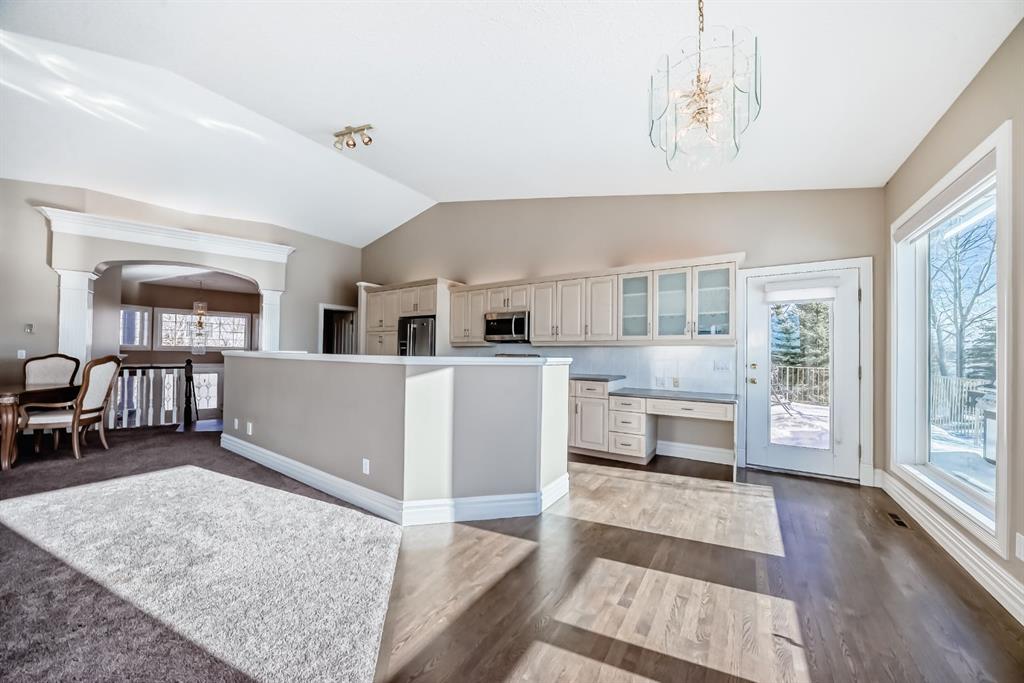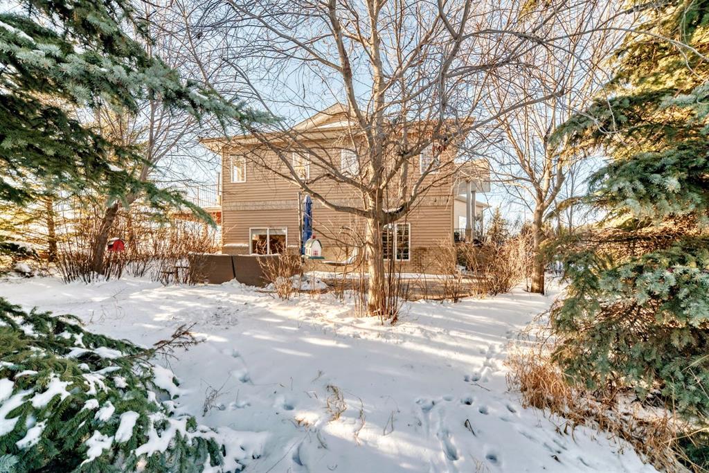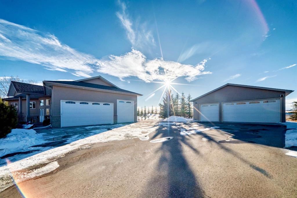 Car or hobby enthusiasts will appreciate the attached triple oversized garage with 14-foot ceilings to accommodate a lift, including one 11-foot high door. This heated & drywalled space also features upper storage, a closet, man door access, & rough-in plumbing for a sink. In addition, a newer 2nd detached triple garage is powered, heated, & drywalled. Surrounded by mature trees, this private property feels like your own personal park. A picturesque gazebo sits beside the pond, which transforms into a skating rink in winter, complete with power & water access. On the back side of the home, enjoy cozy evenings gathered around the fire pit area. The yard offers both mountain & glimpses of downtown Calgary in the distance—an incredible backdrop for everyday living.