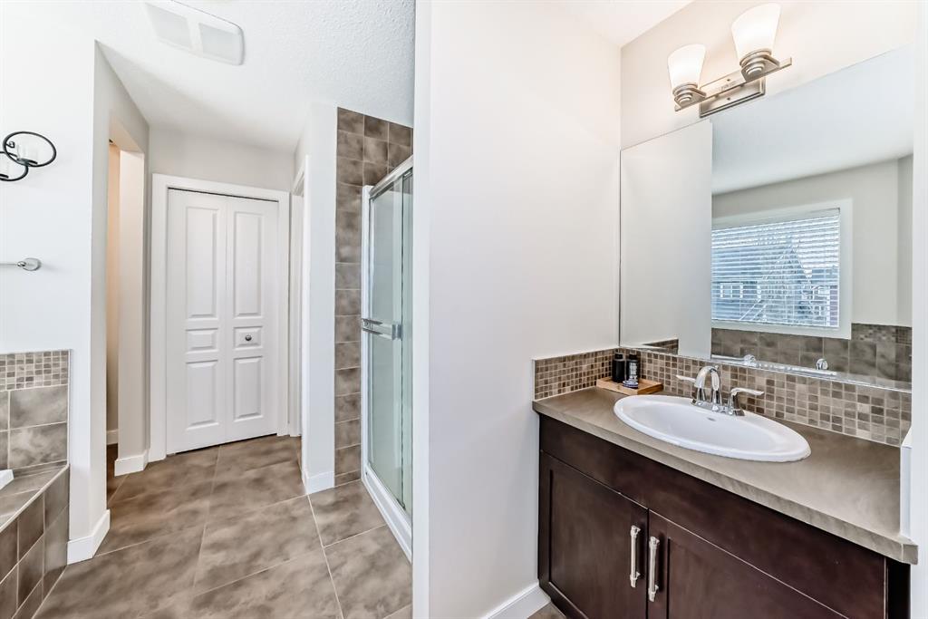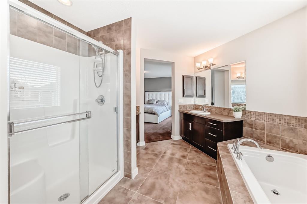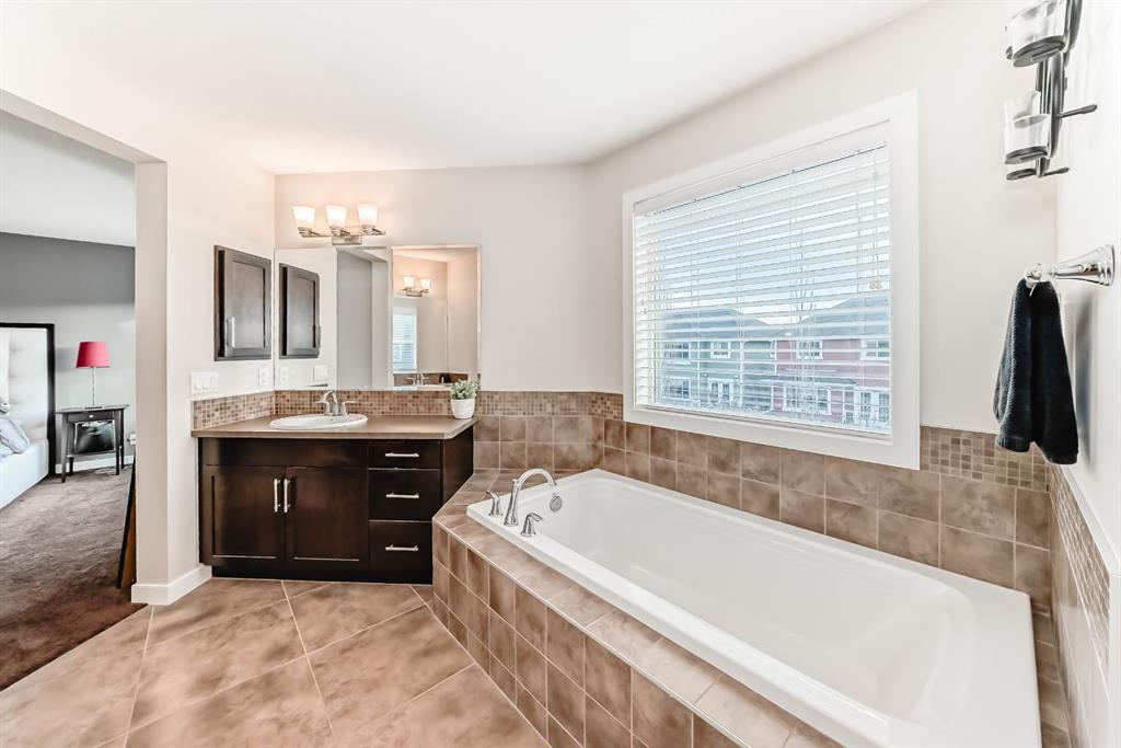 Upstairs is where this home really shines for families. The bonus room, wired for surround sound, is perfect for movie nights or game days, and the office nook easily fits a full-size desk for work or homework. The second and third bedrooms are generously sized, and the primary bedroom feels like a retreat — big enough for a king-size bed, accented by a feature wall, and paired with a spa-style 5-piece ensuite with double sinks, a deep soaker tub, a tiled shower, and a walk-in closet plus linen storage.