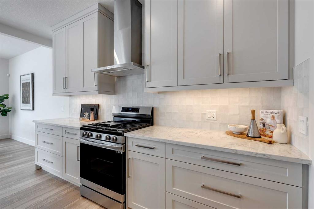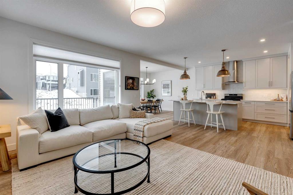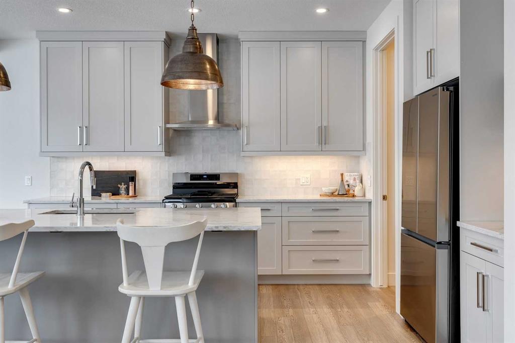 Welcome to the Aspen Show home by JANSSEN HOME’S! This beautiful Showhome is situated in the community of Rivercrest near schools, parks, sports facility, restaurants and plenty of amenities. Now, let ‘s take you inside starting in the foyer on the main floor, you will experience 9ft walls and towering 8ft doors that grant you access to the mudroom, pantry, kitchen, nook, living room and half bath. The TRIPLE pane windows are endless and give so much light that you don’t even need to turn on the lights till dusk. The living rooms focus is a gas fireplace adding comfort for family time on those chilly nights. The spacious designer kitchen includes quartz counters, under cabinet lighting and taller cabinets to ceiling that are equipped with soft close doors and drawers. The Kitchen Island houses a microwave cabinet and dishwasher and is capped off with a 15″ overhang quartz counter that includes an undermount graphite sink. This chef’s kitchen is adorned with Stainless Steel appliances, which includes a refrigerator, gas stove, decorative funnel fan, dishwasher and built in microwave with trim kit. On the upper floor you will be greeted by a beautiful bonusroom with a vaulted ceiling and through the large windows a view of the valley. Included on the upper floor is a spacious laundry room complete with a window for additional light, cabinet with top mount sink and built on site shelving. Janssen Homes is known for their built on site finishing’s which include the deacons bench in foyer, solid pantry shelving, lockers in mudroom, closets and built in linen on upper floor hallway which all helps with keeping life organized. Stunning vaulted ceilings add incredible height and an airy feeling in the Primary bedroom and bonusroom. Now, for the flooring, on the main area, stairs going up to bonusroom are finished with Luxury Vinyl Plank, which is perfect for those busy homes. There is tile in the laundry room, main bath and primary ensuite. Tile in the primary bath has been completed with programmable in floor heat. There is carpet on upper hallway, bedrooms, closets, recreation room and stairs going down to walk out level. Primary ensuite has an executive full tiled shower with rain head and hand shower, bench and is enclosed with a 10ml glass pivoting shower door and side panel. The primary ensuite’s taller vanity cabinet is equipped with plenty of storage space and has double undermount sinks that are topped with quartz. Across from the vanity you will find a stunning oval freestanding soaker tub perfect for the end of day “me time”. The main bath is finished with a fiberglass deep tub/shower for easy cleaning and the vanity is topped with quartz and also includes an undermount sink. The OVERSIZED double garage can accommodate two vehicles comfortably and still leaves plenty of space for storage. Also included – A/C, Trimedge Ext Lights, Blinds and Landscaped!!! This is a must see as there is so much more to see! Please note that the photos are of the showhome.