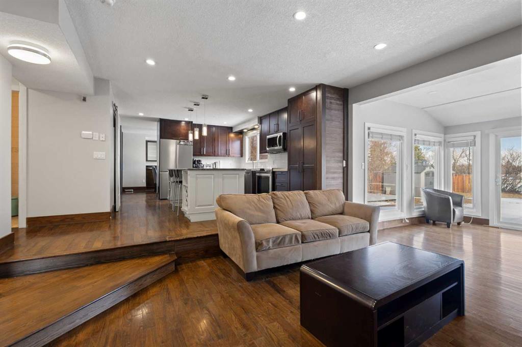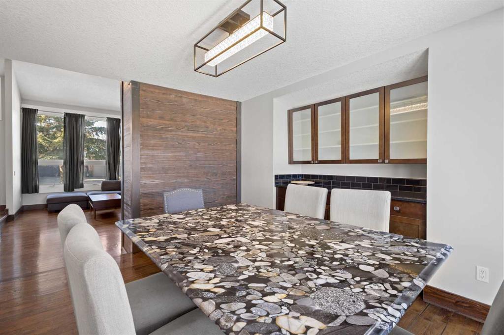 Beautifully renovated two-storey split backing directly onto Canyon Meadows Golf Course, situated on a large private lot over 10,000 sq ft. This spacious home offers an impressive layout with 5½ bathrooms, 5 bedrooms plus a den/office, a heated garage studio (illegal suite) with kitchenette and bathroom, and a side entrance to a fully finished basement with kitchenette (illegal suite), one bedroom and a den.
