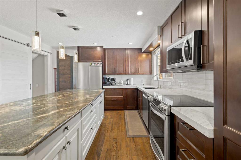 The renovated kitchen is a standout feature, showcasing rich cabinetry, stainless steel appliances, tile backsplash, and a large central island with granite countertops and seating. The kitchen provides excellent storage and workspace while overlooking the main living areas.