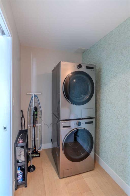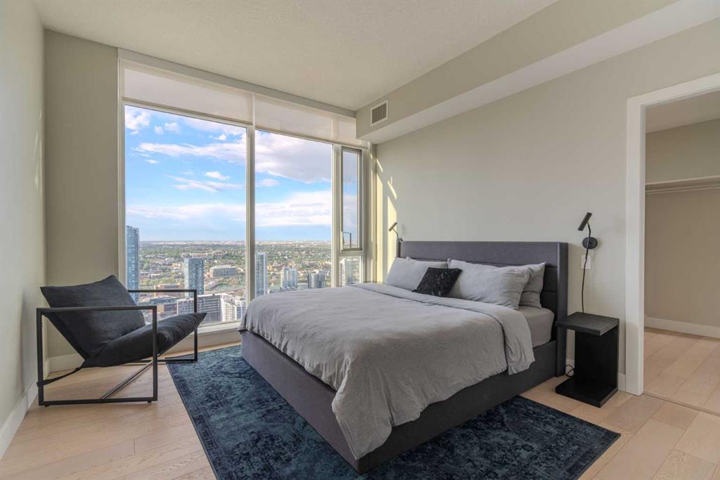 Enjoy unobstructed, panoramic views of both the downtown skyline and the majestic Rocky Mountains through floor-to-ceiling windows that flood the home with natural light. The north-west exposure is completely un-obstructed corner to corner, ensuring privacy and an incredible backdrop to every room. A expansive wraparound balcony comes complete with natural gas connection. The sleek, modern kitchen is equipped with Miele appliances and premium Armony Cucine cabinetry from Italy, complete with a sophisticated silent-close system found throughout the kitchen and both ensuites.