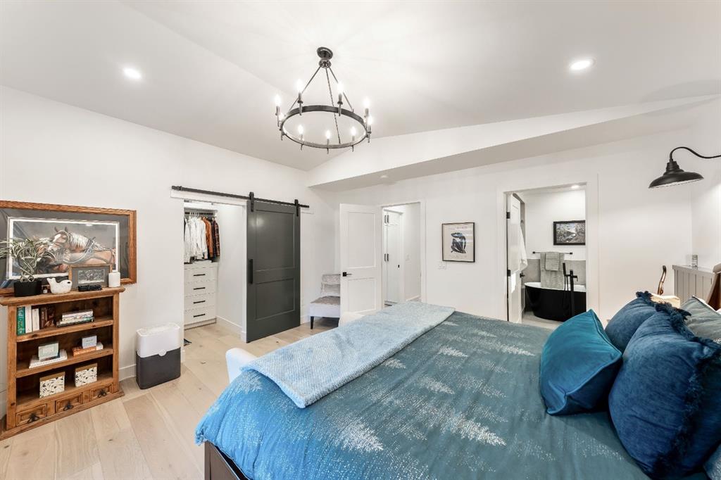 Down the hall, the spacious primary suite offers a peaceful retreat with vaulted ceilings, a feature accent wall, and a custom walk-in closet with extensive built-ins. The spa-inspired ensuite includes dual sinks, a freestanding soaker tub, a rainfall shower with bench, heated floors, and floating vanities—luxurious details that elevate everyday living. The second primary bedroom also features its own walk-in closet and private ensuite, making it ideal for guests or multigenerational living, while the stylish powder room completes the main level.