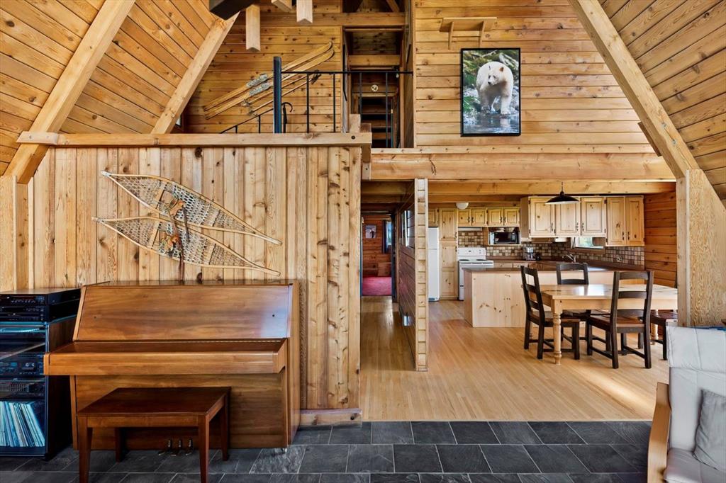 Step inside and your eyes are instantly drawn to the great room’s dramatic wall of windows framing ever-changing vistas – morning fog drifting along the river valley, chinook arches sweeping winter skies, and storm clouds rolling across the landscape in nature’s constant theatre. Warm cedar walls and ceilings create an intimate atmosphere, while natural slate flooring grounds you in earthy elegance. Vintage skis and snowshoes adorning the walls speak to outdoor living – evenings by the fire after days spent exploring the outdoors.