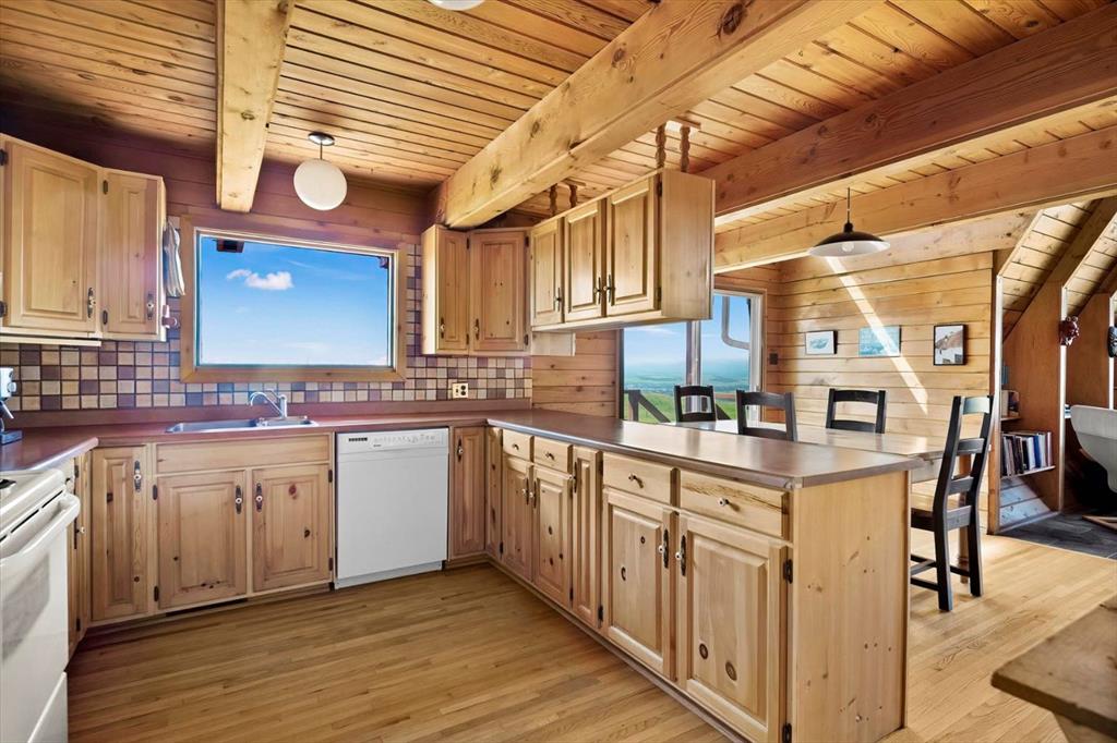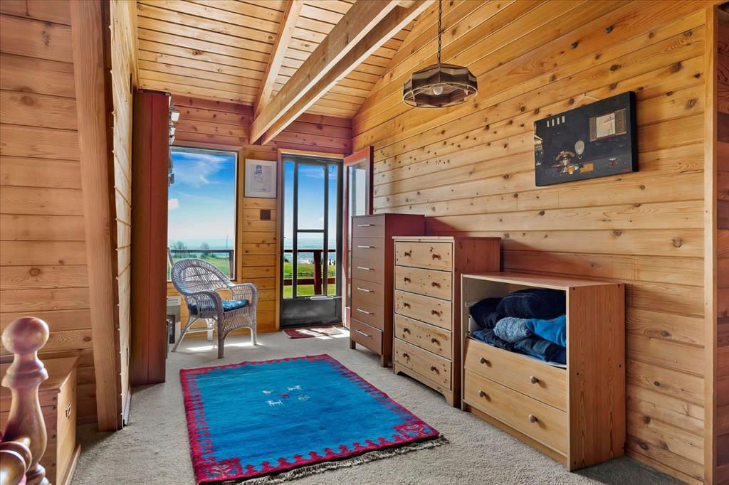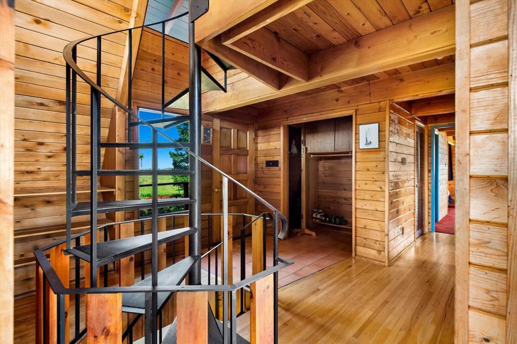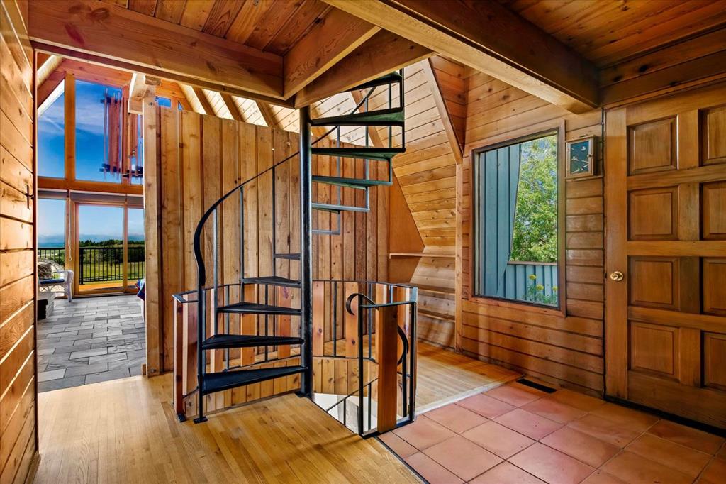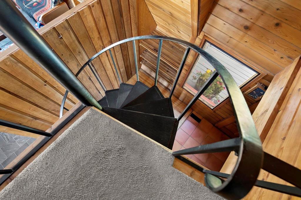 The distinctive spiral staircase connects three thoughtfully designed levels. The main floor offers rustic charm with knotty pine kitchen cabinetry, hardwood floors, and a wonderful bunkhouse-style bedroom that sparks childhood memories. Upstairs, two bedrooms include a versatile space perfect for an office, while the primary suite features a private balcony retreat for morning coffee while soaking in those remarkable views. The walkout basement provides flexible space with practical tiled floors and even includes a surprise climbing wall for adventure-seekers.