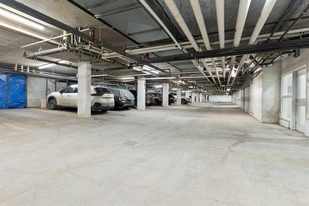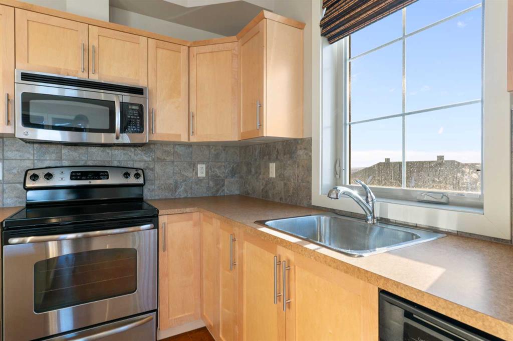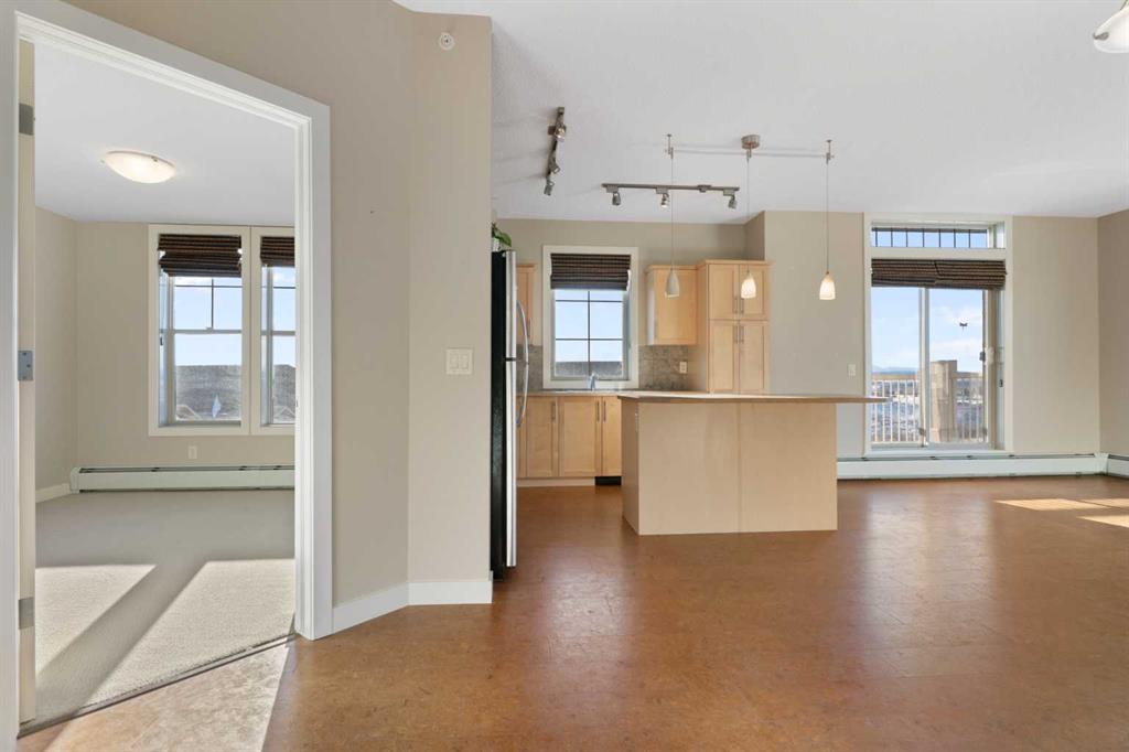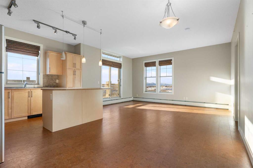 180-DEGREE PANORAMIC MOUNTAIN VIEWS! Experience the pinnacle of condo living in this rare top-floor corner unit, specifically positioned to offer breathtaking views and stunning sunsets. As a premium corner residence, this home features extra windows on two sides, flooding the open-concept design with amazing natural light. The interior boasts 9-foot ceilings and upgraded cork flooring throughout the main living areas. The chef-inspired kitchen is complete with stainless steel appliances, elegant maple cabinetry, a large eat-up island, and abundant counter space. The spacious primary suite easily accommodates a king-sized bed and features a walk-in closet and a private 3-piece ensuite. A second bedroom, a 4-piece main bath, and a versatile flex den/tech-centre provide the perfect layout for a home office or guest space. Enjoy summer evenings on the balcony with a built-in gas BBQ hook-up. This unit includes two titled parking stalls—one heated underground stall located right beside the elevator with a private storage locker, plus an additional surface stall. Building amenities include double elevators and access to a fitness room. A rare top-floor gem offering unmatched comfort, convenience, and unbeatable mountain vistas.