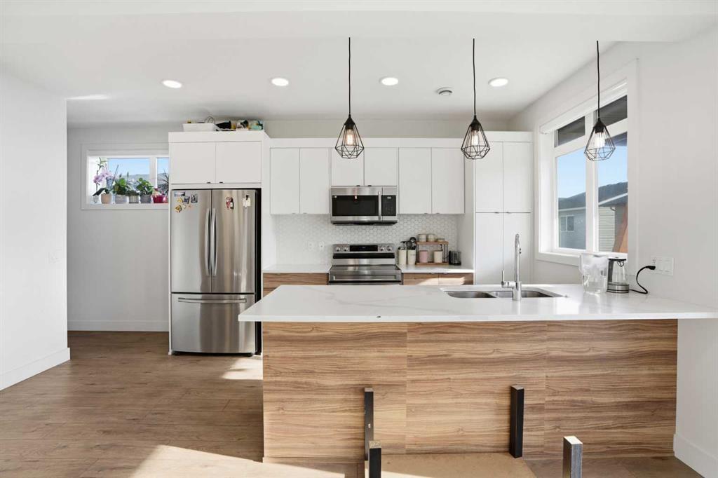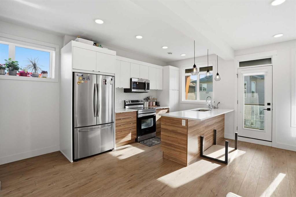 Gorgeous 3-Storey Townhome | Located in the Heart of Savanna NE | 3 Bedrooms | 2.5 Bathrooms | Sleek & Modern Design | Two Toned Kitchen | Honeycomb Backsplash | Stainless Steel Appliances | Kitchen Breakfast Bar | Open Floor Plan | High Ceilings | Large Windows | Incredible Natural Light | Recessed Lighting | 2 Balconies | Attached Garage. Gorgeous 3-storey townhome located in the heart of Savanna NE, offering 3 bedrooms, 2.5 bathrooms, and a sleek, modern design throughout. The front entry opens to stairs leading up to the bright and spacious main (2nd) level, while entry from the attached garage conveniently bypasses the lower level and also brings you directly to the main living space.