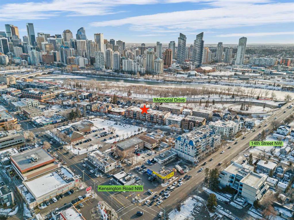 Welcome to this top floor condo in Providence Kensington, ideally located in the heart of Hillhurst, one of Calgary’s most desirable inner city communities. This beautifully maintained 2 bedroom, 2 bathroom condominium offers executive finishes, a functional open-concept layout, and an unbeatable walkable lifestyle, just steps from Kensington shops and restaurants, the Bow River pathway system, public transit, and downtown Calgary. The interior features 9 foot ceilings, Brazilian Tigerwood hardwood flooring, air conditioning, and a warm, modern neutral colour palette. The chef-inspired kitchen is both stylish and practical with walnut cabinetry, granite countertops, stainless steel appliances, a natural gas stove, corner pantry, and an island with breakfast bar, perfect for entertaining. The refrigerator, washer, dryer, and kitchen faucet are all under one year old, offering added value and peace of mind for the next owner. The bright living room opens to a spacious north facing balcony with tranquil views overlooking the St. John Centre and surrounding green space. The thoughtfully designed floor plan places the bedrooms on opposite sides of the unit, ideal for privacy, guests, or a work-from-home setup. The primary bedroom retreat includes a walk-through closet and a generous 5-piece ensuite with dual sinks and an oversized walk-in shower. The second bedroom features a walk-in closet and is conveniently located next to the 4 piece bathroom and insuite laundry. Additional features include one titled underground parking stall, a dedicated storage locker, access to a fitness centre, and a secure bicycle storage room. North facing, top floor condos in Providence Kensington rarely come to market, making this a fantastic opportunity for professionals, downsizers, or investors seeking a premium inner-city Calgary condo. Don’t miss your chance to own in one of Calgary’s most vibrant communities!