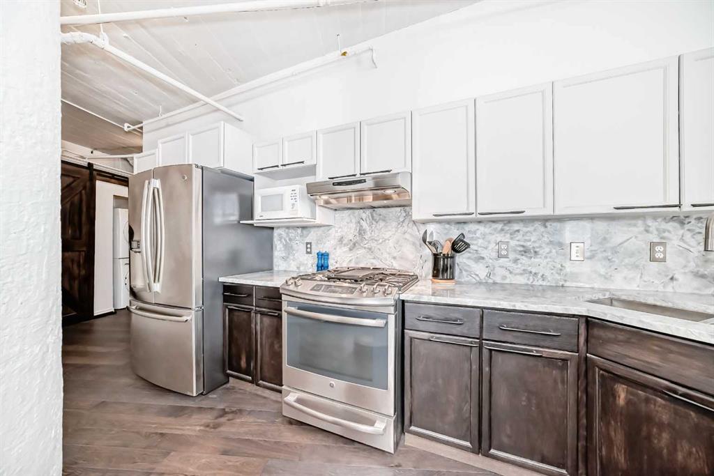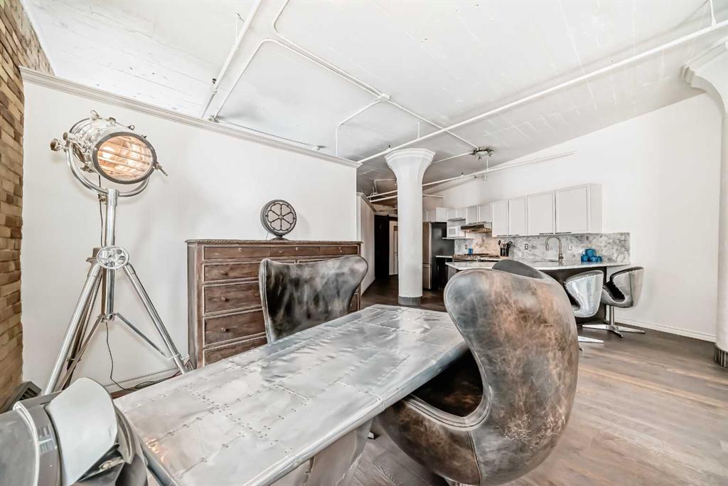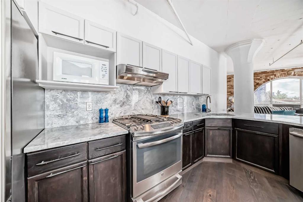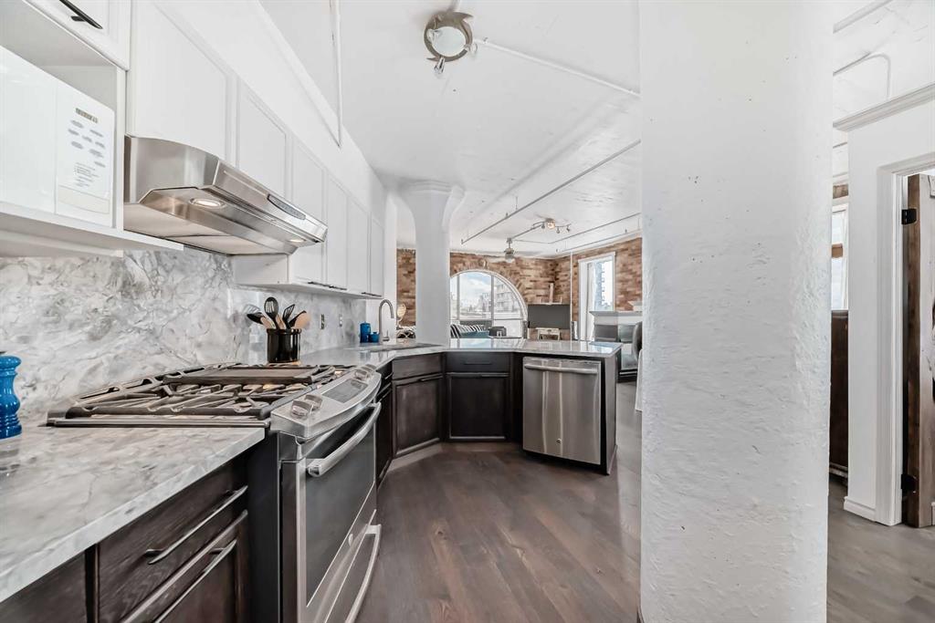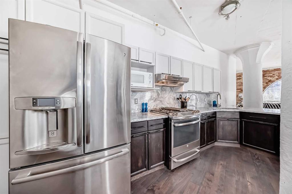 Own a piece of Calgary’s history in this stunning corner unit at Lewis Lofts. Perfectly positioned in the heart of the Beltline, this 4th-floor residence blends timeless architectural charm with modern comfort. High ceilings, exposed brick and concrete, a modern floor plan, and a signature arched window create a bright, open living space full of character. The thoughtfully updated kitchen features stone countertops, stainless steel appliances, and a gas range, flowing seamlessly into the living area complete with hardwood floors, a gas fireplace, and downtown views. Retreat to the private bedroom with a walk-in closet and ensuite. Enjoy your own balcony, plus access to a rooftop garden with gazebo and BBQ. Complete with underground parking, storage, and in-suite laundry, this pet-friendly, adult-only building places you steps from Calgary’s best restaurants, shops, transit, and entertainment.