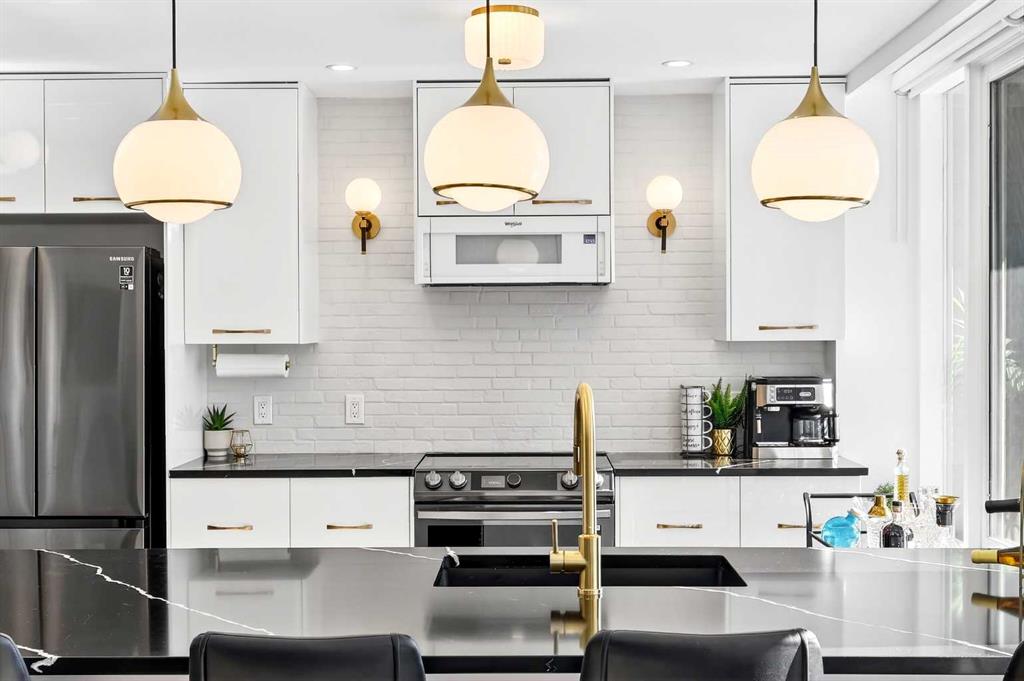 Step inside to a bright, open-concept living space filled with natural light from expansive south-facing windows. Elegant raised paneling and wide luxury vinyl plank flooring create a refined yet inviting atmosphere throughout. The thoughtfully redesigned kitchen is a culinary dream, featuring ceiling-height white cabinetry, a stylish white brick backsplash, sleek black quartz countertops, and generous counter space perfect for both everyday living and entertaining.