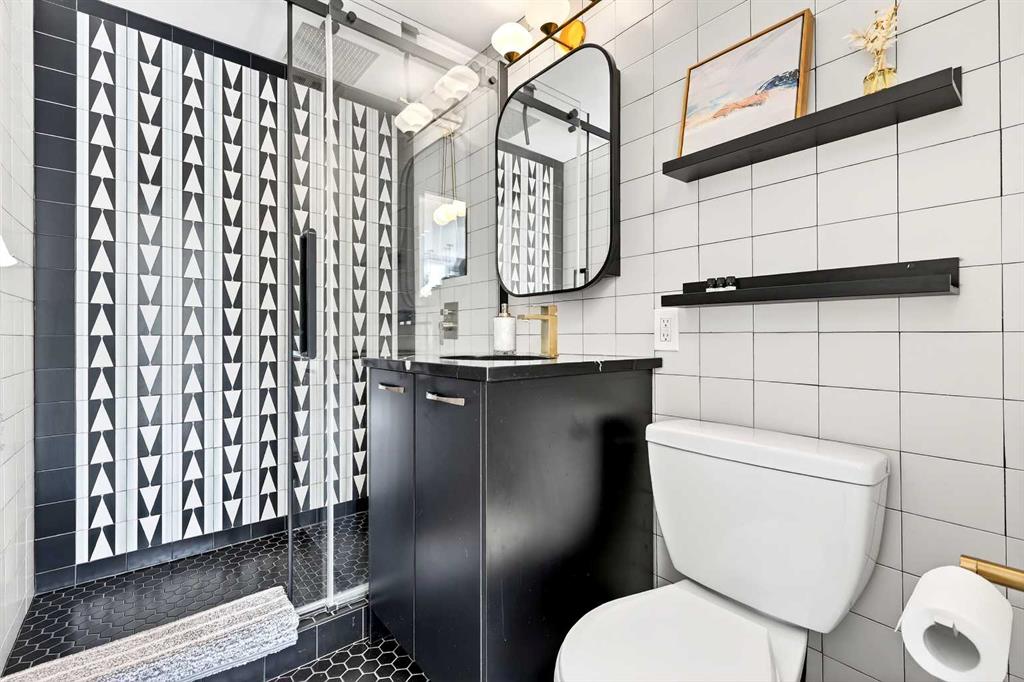 The bathroom showcases art-deco inspired tilework, complemented by warm brass fixtures, a luxurious 12-inch rain showerhead, and a cleverly integrated mirrored cabinet for additional storage. Opposite the kitchen, the living room offers a stunning focal point with raised paneling and a charming weathered white brick fireplace frame, providing the perfect canvas for your own creative décor.