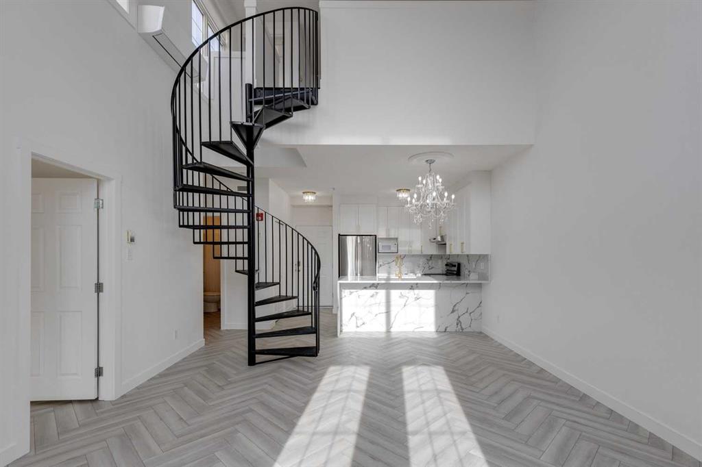 Upstairs, a spiral staircase leads to a loft overlooking the main living area — the perfect space for a home office or reading retreat — and your private rooftop patio offering breathtaking north and south skyline views.