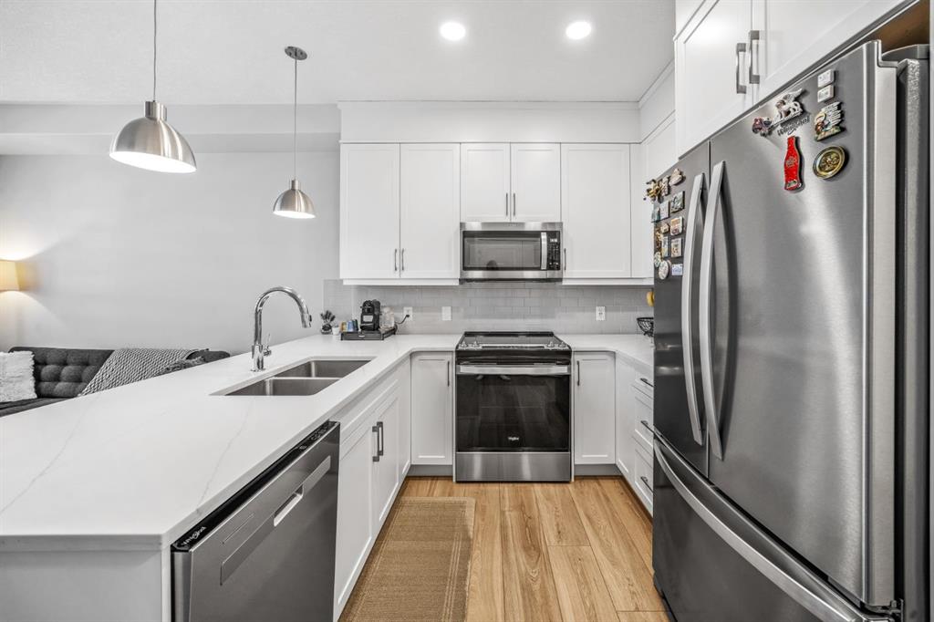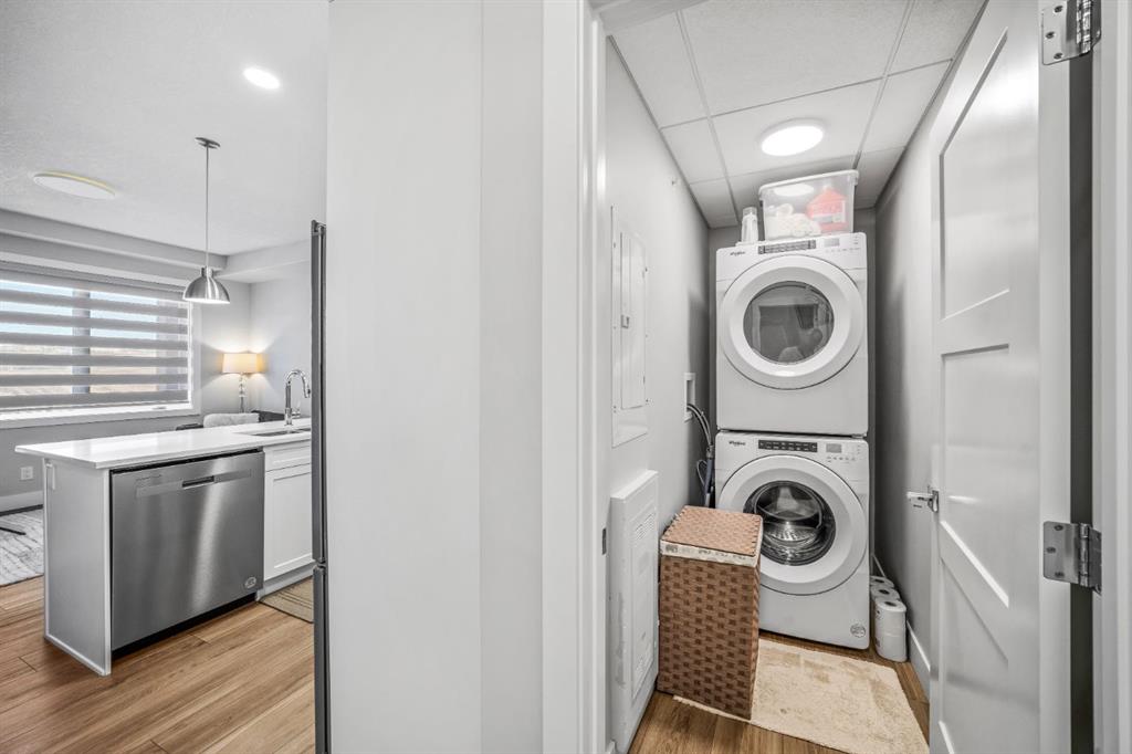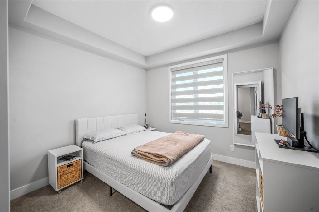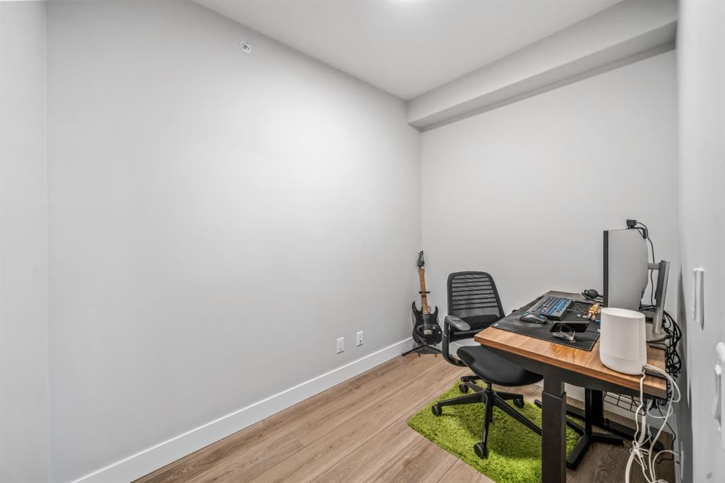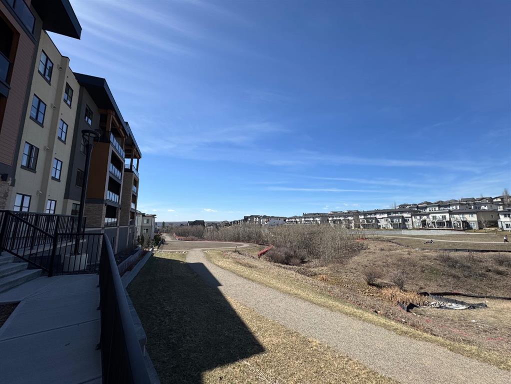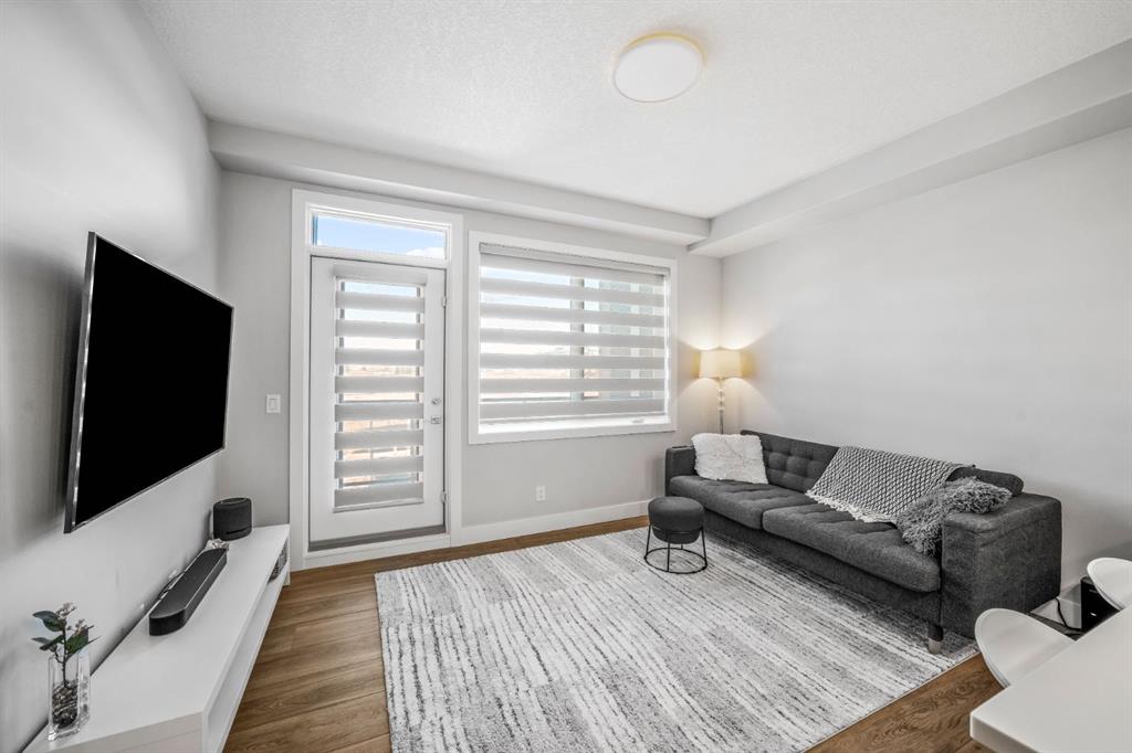 Welcome to this well maintained one bedroom plus den residence in the sought after 85th and Park building, completed in 2023 by Cove Properties. Set beside a protected ravine with walking paths bike trails, scenic pond, dog friendly, and beautiful Rocky Mountain views, this location offers a quiet setting just minutes to Aspen Landing mall, and a short drive to downtown Calgary. This efficient layout offers approximately 600 square feet with a bright open concept design. The kitchen features generous counter space, ample cabinetry, quartz countertops, and stainless steel appliances. The den works well as a home office or flex space.