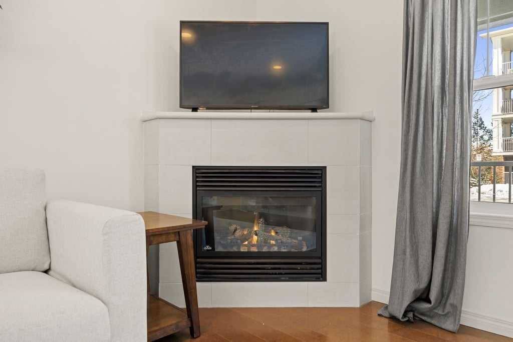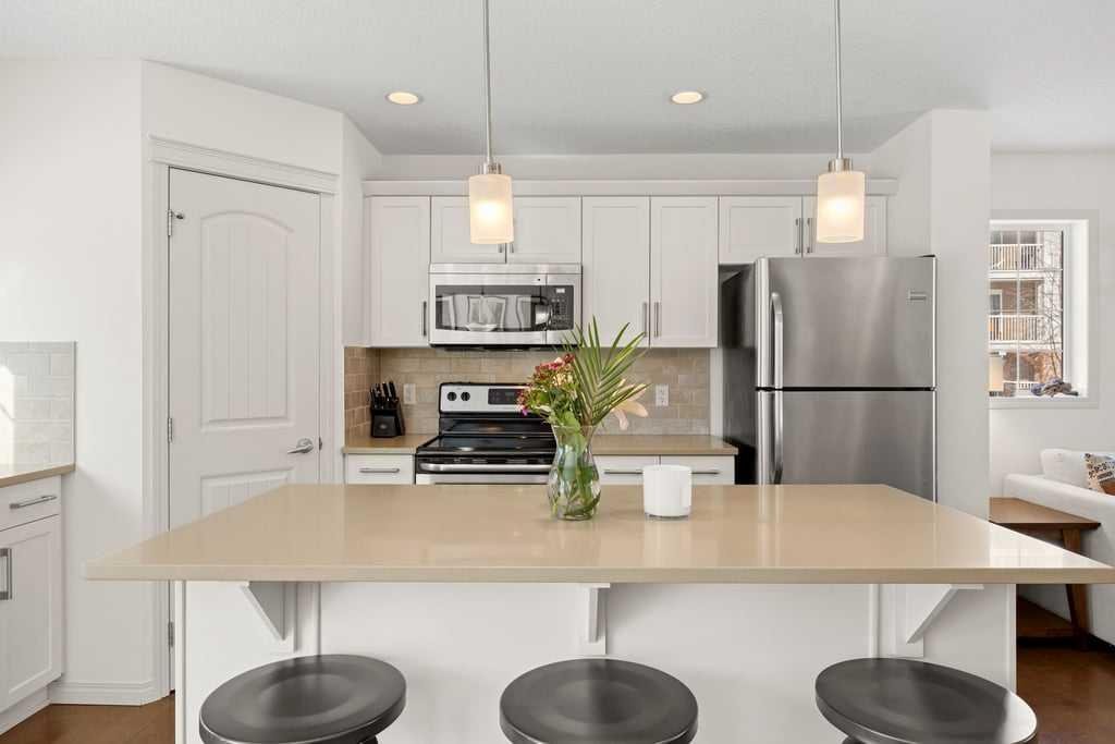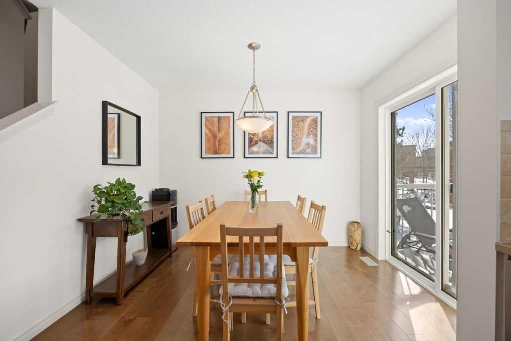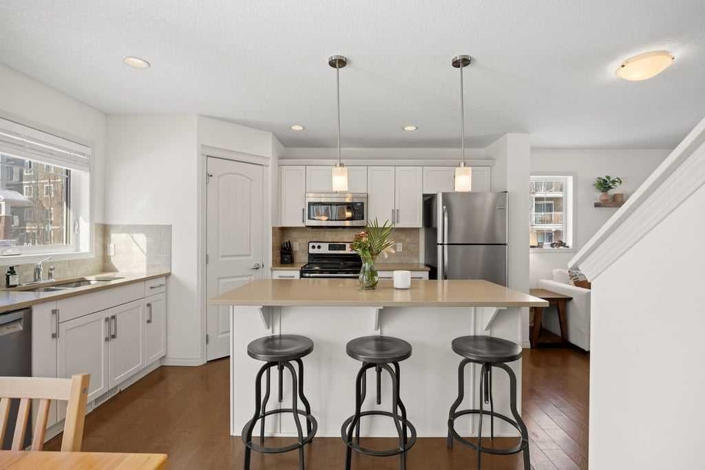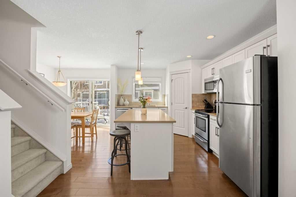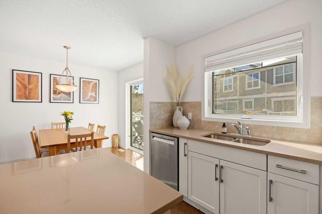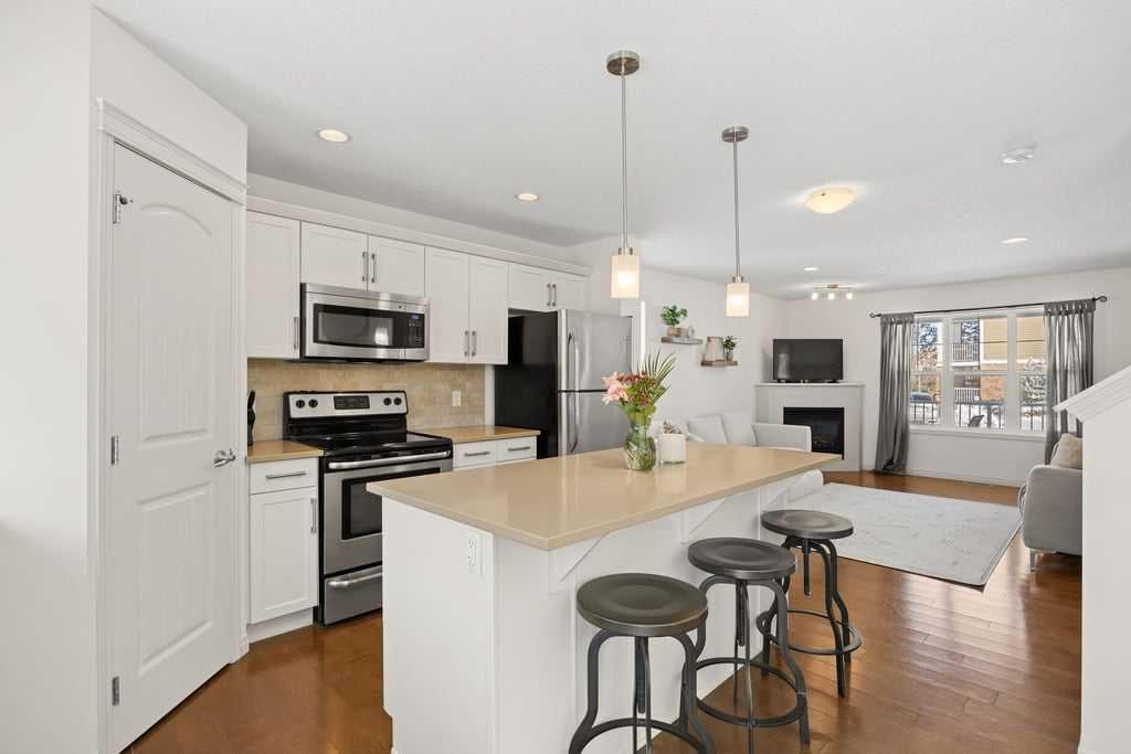 **OPEN HOUSE – Sunday, Mar 1 (12-2pm)**Welcome to this bright end-unit townhome in the heart of Cranston, backing onto the complex’s green belt for added space and privacy. Thoughtfully maintained and refreshed, the home features new paint throughout the main floor and upper level (February 2026), creating a clean, modern feel from the moment you step inside. The main floor offers an open, comfortable layout where the kitchen, dining, and living areas flow together seamlessly — finished with hardwood flooring, a cozy gas fireplace, stainless steel appliances, quartz countertops, a large island, and a recently upgraded Bosch dishwasher (June 2024) that enhances both style and everyday functionality.