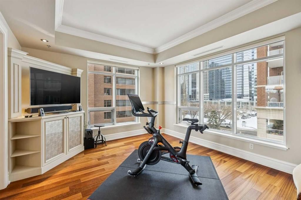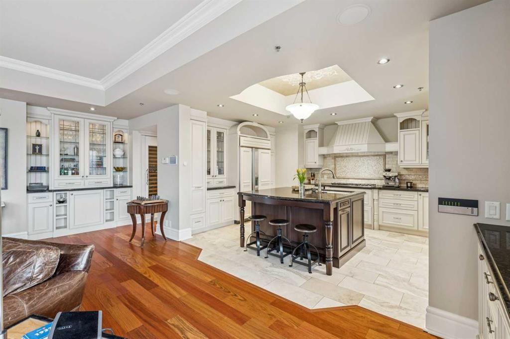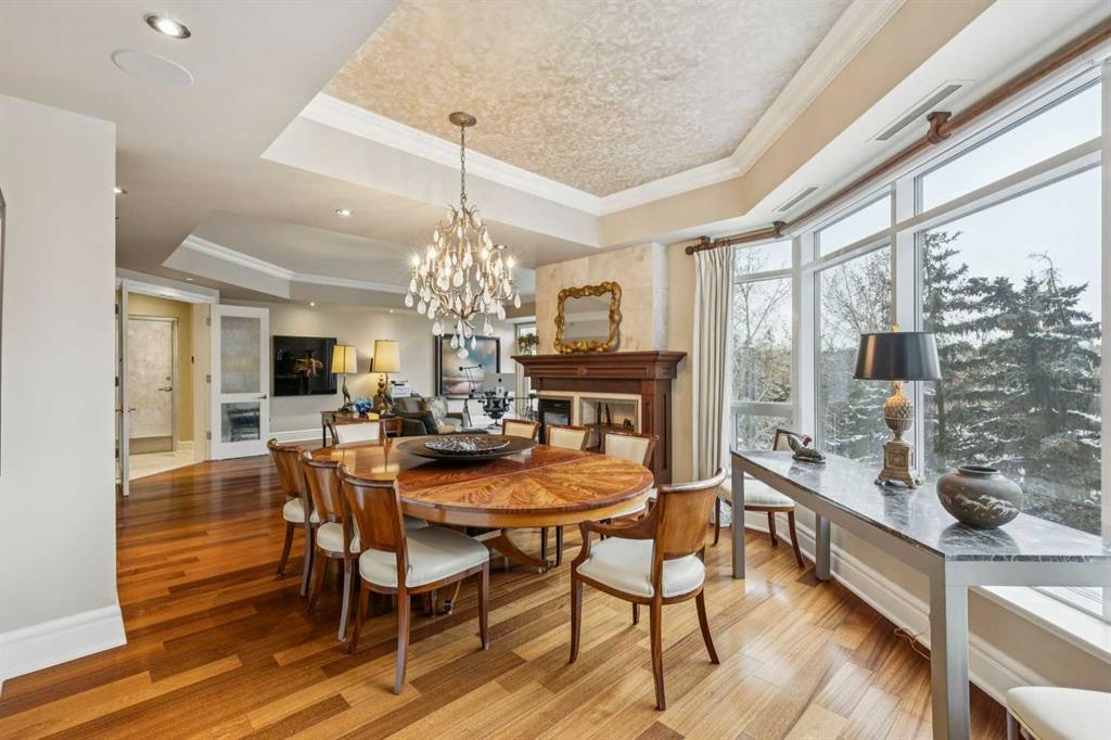 Welcome to Princeton Grande, one of Calgary’s most prestigious & exclusive riverfront addresses in the heart of Eau Claire, perfectly positioned along the Bow River & directly across from the natural beauty of Prince’s Island Park. This extraordinary 3,065 sq. ft. private sub-penthouse offers an exceptional standard of luxury living, where timeless elegance, architectural scale & breathtaking river & park views come together to create a truly remarkable home. A private elevator opens directly into the residence, revealing expansive interiors designed for sophisticated entertaining & refined everyday living. Grand principal rooms are framed by oversized windows that capture sweeping views of the river & park, while high coffered ceilings, custom millwork, & elegant designer finishes elevate every space. The stunning formal living room, anchored by a double-sided gas fireplace & surrounded by windows, creates a dramatic yet inviting setting while the gracious dining room is perfectly suited for hosting memorable dinners & special occasions against a backdrop of spectacular views. The chef-inspired kitchen is beautifully appointed with granite countertops, custom cabinetry, & an expansive pantry, offering both functionality & understated luxury. Flowing effortlessly into a bright south-facing breakfast nook & a comfortable family room, with access to a private terrace ideal for outdoor dining & enjoying river views. A refined den with custom built-ins provides the perfect executive office or private library (could be used as a 3rd bedroom). The luxurious primary suite is a tranquil sanctuary featuring a spacious walk-in closet, private balcony, & a spa-inspired ensuite complete with a deep soaker tub, glass-enclosed shower, and dual vanities. A second bedroom with its own ensuite & large closet offers exceptional comfort & privacy for guests. Additional highlights include 371+ sq. ft of outdoor living space on two balconies, a dedicated laundry room, central vacuum system, built-in speaker system, abundant in-suite storage, two titled underground parking stalls a short distance to the elevator, & a titled storage locker. Residents of Princeton Grande enjoy an unmatched collection of five-star amenities designed for comfort, wellness, & entertaining. These include 24-hour concierge & security, an elegant lobby with fireplace lounge, beautifully appointed guest suites, a private library & conference room, temperature-controlled wine storage with a tasting room, a sophisticated residents’ lounge with full kitchen & terrace, fully equipped fitness center, a dedicated yoga studio, steam room with change facilities, an underground car wash bay, & a private freight elevator for discreet service & move-ins. Surrounded by the Bow River pathways, steps to downtown’s finest dining, cultural venues, & vibrant urban amenities, this exceptional residence offers a rare opportunity to experience luxury condominium living at one of Calgary’s most distinguished & sought-after addresses.