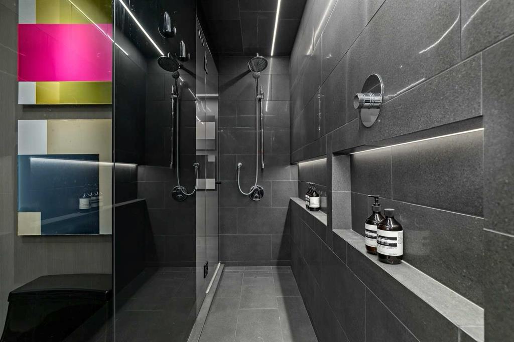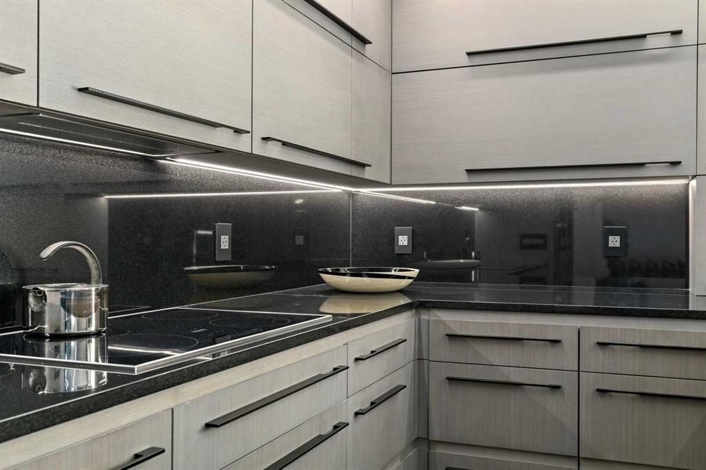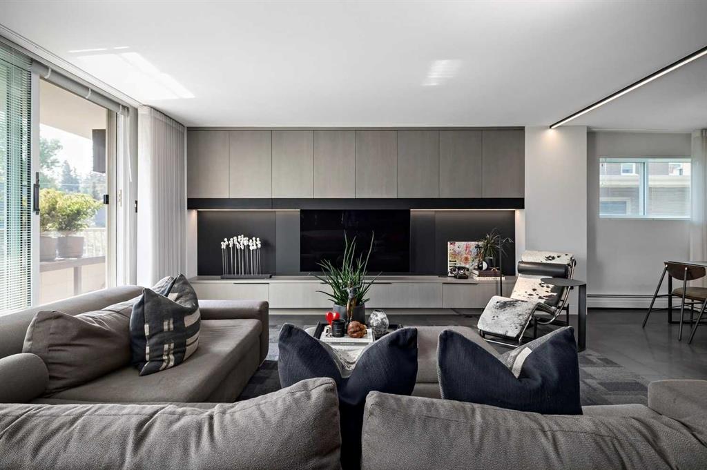 An unprecedented offering in Calgary’s prestigious Mount Royal. Welcome to Palace Royale — a mid-century modern icon of concrete construction, meticulously revitalized with a new roof, boiler, elevator, and a fully restored exterior envelope. Perfectly poised steps from vibrant shops, galleries, cafés, and the downtown core, this residence fuses architectural pedigree with cosmopolitan living at its finest. Formerly a two-bedroom, the residence has been masterfully reimagined into a grand one-bedroom with an opulent dining salon — a bold design statement that can easily be converted back to 2 bedroom, if desired. Every inch of this 1,009 sq. ft. interior radiates luxury, with more than $300,000 invested in finishes and technology of uncompromising quality. The chef’s kitchen is a triumph of form and function: reconstructed oak millwork, striking black granite surfaces, and a fully integrated Miele ensemble — including built-in coffee station, steam and wall ovens, dishwasher, 32” induction cooktop with concealed Faber hood, and freestanding refrigerator/freezer. This is a kitchen designed not merely for cooking, but for performance. The living space is both dramatic and intimate, defined by architectural millwork, black glass accents, and LED illumination. Hidden at first glance, entertainment unfolds with a motorized 65” drop-down television, James Loudspeakers, subwoofer, and six-zone surround sound — transforming the room into a private cinema. The primary suite is pure indulgence: wall-to-wall wardrobes, a custom platform bed with integrated storage, leather-padded headboard accented with linear LED lighting, and a discreetly incorporated 55” television with Bluesound audio. The ensuite rivals world-class spas with bespoke cabinetry, a sculptural black-glass shower, Kohler fixtures, and a soaring mirror wall. The main bath is equally spectacular, anchored by a double porcelain Lappato tile shower with multiple showerheads encased in glass — an architectural centerpiece rarely seen even in the city’s most exclusive residences. Refinements extend throughout: porcelain Lappato flooring, triple-pane Lux windows, Ripplefold drapery with Hunter Douglas blinds, reverse-osmosis water filtration, soft water system, LeGrand lighting controls, and bespoke foyer millwork concealing pantry, coat, and shoe storage. Step outside to the wraparound south- and west-facing balcony, where lush treetop views give way to the glittering downtown skyline. Complete with a built-in Broil King BBQ and elegant lounge area, it is an outdoor sanctuary unlike any other. A private adjacent storage room and secure underground parking stall elevate both convenience and exclusivity. Palace Royale is more than a home — it is theatre, artistry, and refinement. A singular residence for the connoisseur who demands the exceptional, set within one of Calgary’s most celebrated enclaves.