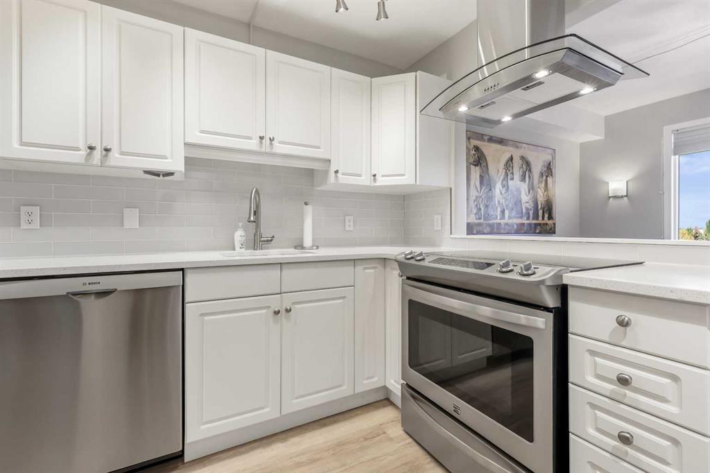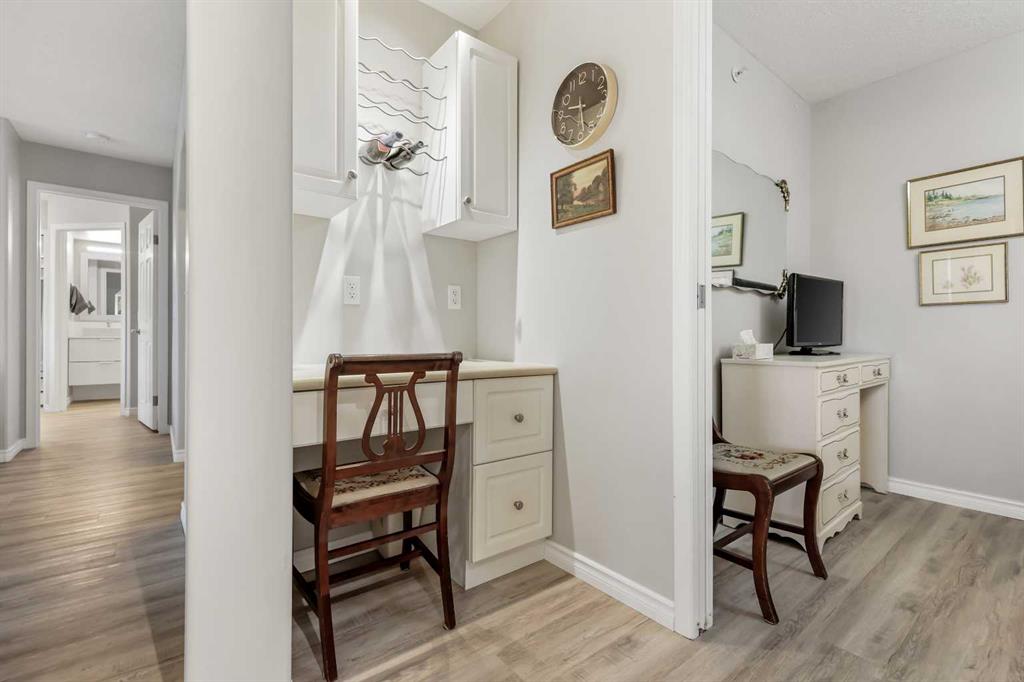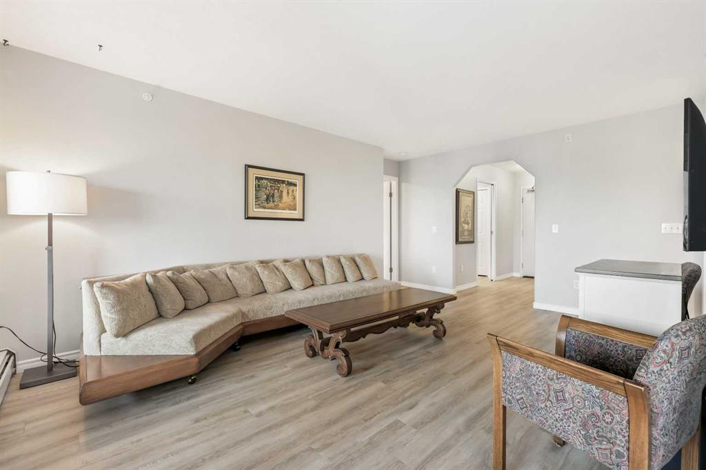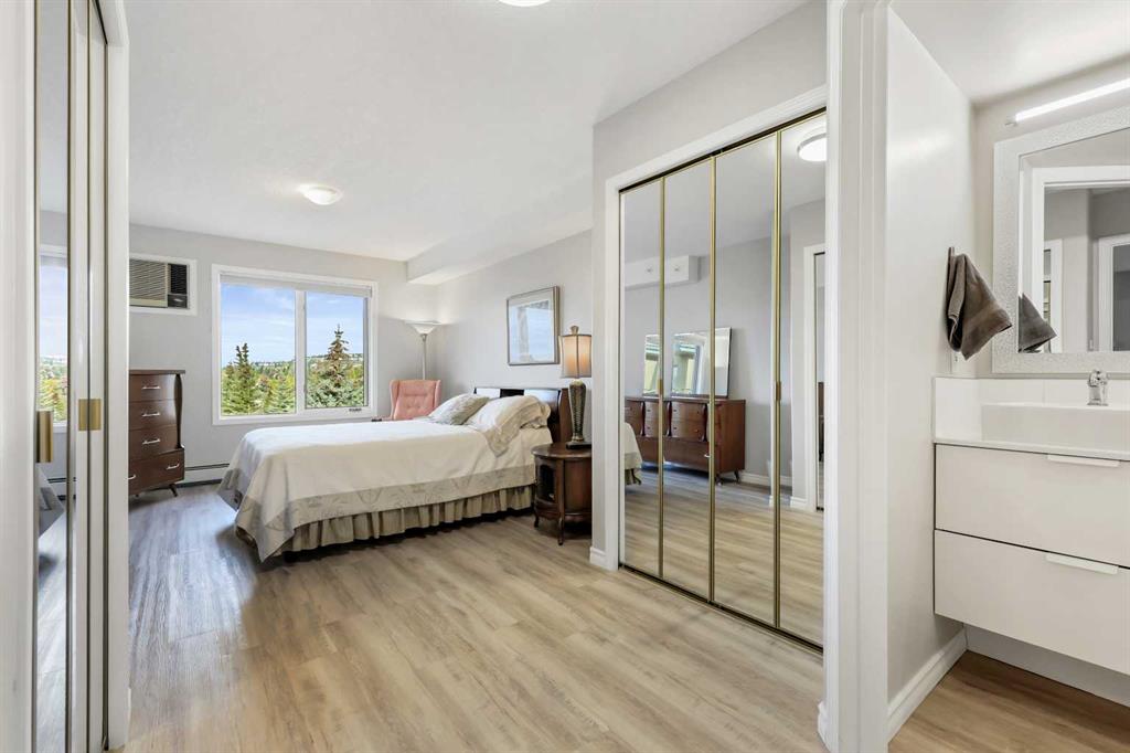 Welcome to #404, 7239 Sierra Morena Boulevard SW – a bright and spacious 1 bedroom plus flex room, 2 bathroom condo located on the 4th floor (top floor) of the desirable Sierras of Richmond Hill, a welcoming 55+ adult community in the heart of Richmond Hill. Very bright and open with updated flooring throughout, this beautifully updated unit features a well-equipped gourmet kitchen with lots of cabinetry, open to a dining room – perfect for cooking, entertaining, and gathering with friends. The generous open-concept great room flows seamlessly into a private sunroom with stunning mountain views – ideal for enjoying your morning coffee or peaceful sunsets.