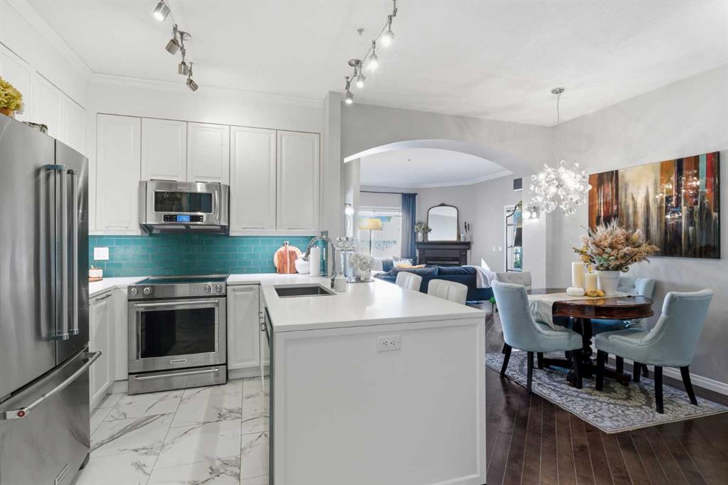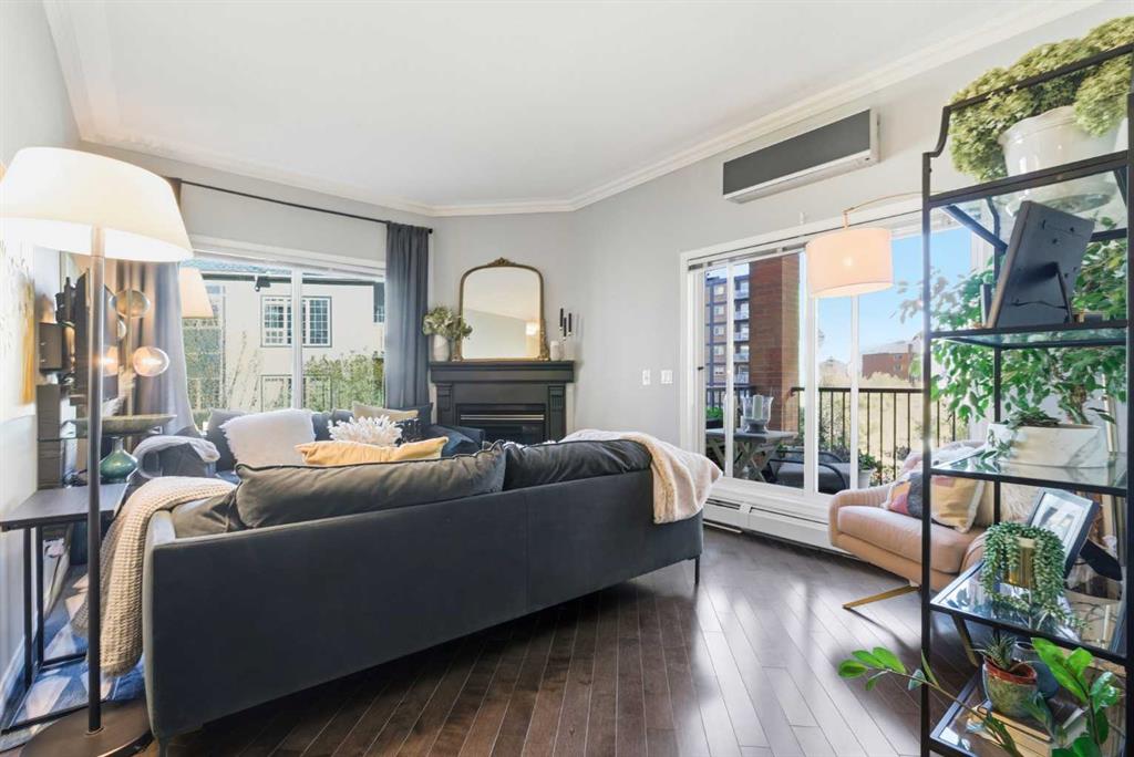Experience sophisticated urban living in this beautifully upgraded 2-bedroom, 2-bathroom executive condo, ideally located with direct +15 access to GoodLife Fitness, London Drugs, top restaurants, and just steps from the boutiques and nightlife of 17th Avenue. Enjoy a highly walkable lifestyle with easy access to downtown and the Bow River Pathway system. This light-filled, modern residence features designer lighting, expansive windows, and an open-concept layout. The chef-inspired kitchen boasts a sleek peninsula island with eating bar, premium stainless steel appliances, classic subway tile backsplash, and timeless white cabinetry. An elegant dining area flows into the spacious living room, complete with a stylish fireplace and breathtaking panoramic city views. Step onto the covered balcony to enjoy morning coffee or evening sunsets year-round. The primary suite offers a luxurious retreat with a full private ensuite, while the second bedroom and full guest bath provide comfort and flexibility. Additional features include in-suite laundry, secure underground parking, and ample storage.Perfect for professionals or those seeking an upscale urban sanctuary—this home offers the ultimate in downtown luxury living.