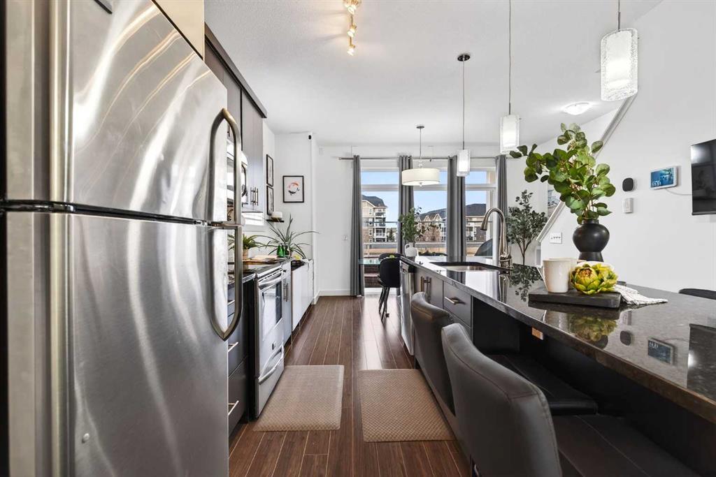 SHOW HOME upgrades – END-UNIT 1,380 sq. ft., this bright townhouse in Redstone features 2 bedrooms, 2.5 bathrooms, with unobstructed Mountain VIEWS off the dining room balcony & master bedroom, a main-level office/den/gym/ flex room, and an extra-large single attached garage. Enjoy bright sunshine throughout the entire home, the large windows in the primary bedroom. Added privacy bonus: NO neighbours directly facing your front door. The ground level welcomes you with a spacious front entry and a versatile office/den or recreation space, along with a convenient 2-piece bathroom, an oversized attached heated garage with ample storage, built in desk & shelves, and enough room for a workbench. Upstairs, laminate flooring flows through the open-concept main level. The kitchen offers dark cabinetry, stainless steel appliances, and an extra-large island (ideal for casual seating and hosting), opening to a family-sized dining area with patio doors to the generous balcony with gas line for BBQ—perfect for morning coffee with the views. The living room is anchored by a custom built feature wall/wall unit, creating a stylish and functional gathering space. The upper level includes a primary bedroom with mountain views, a 4-piece ensuite, and double closets, plus a second spacious bedroom, walk in closet and another 4-piece bathroom. A dedicated laundry and storage room completes the layout. Close to parks, pathways, schools, transit, and major routes for commuting, this Redstone home delivers space, light, privacy, and views. Call for viewing.