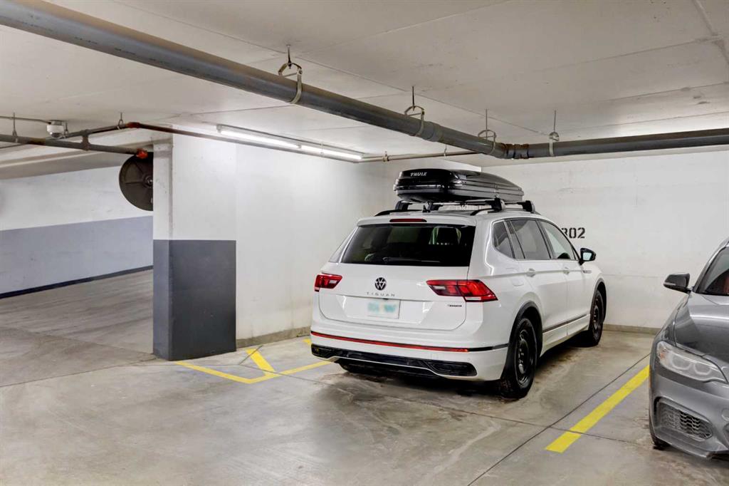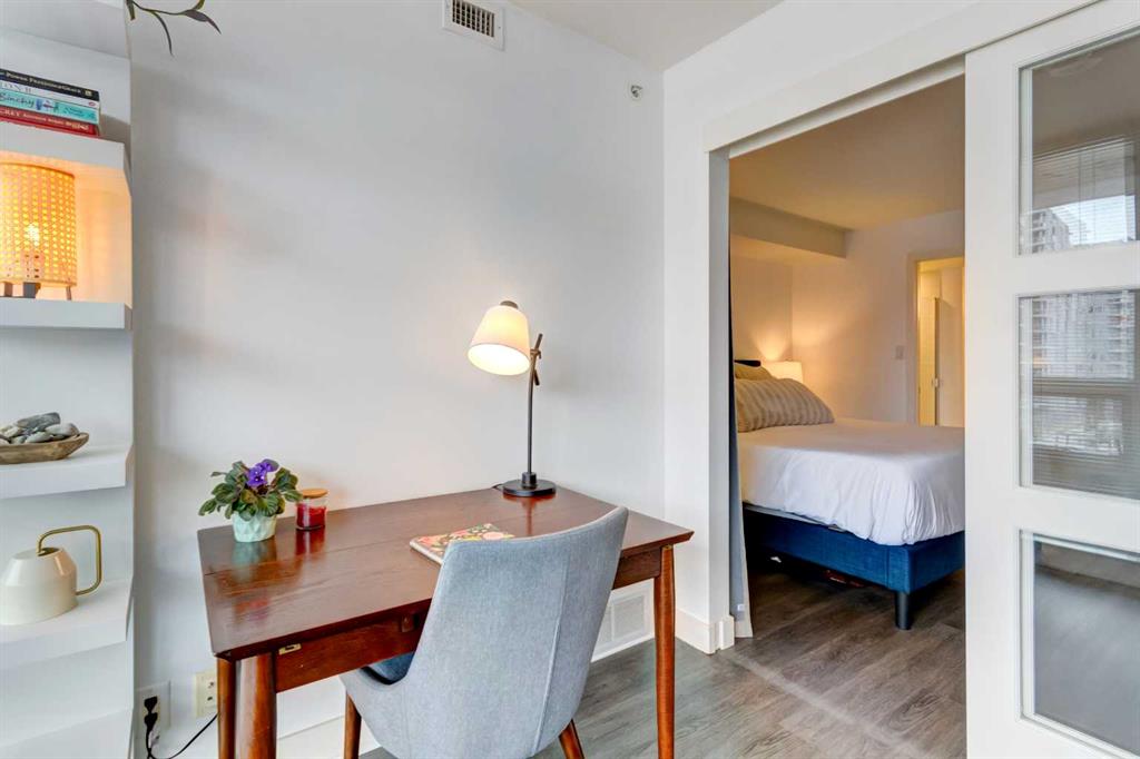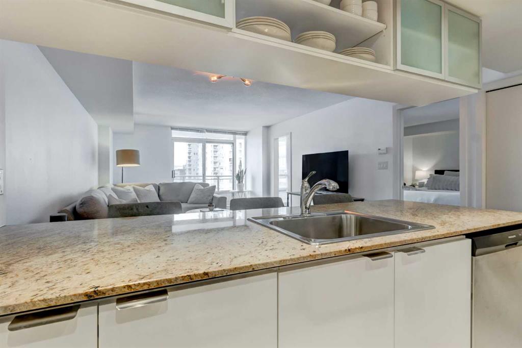Welcome to this bright & beautifully designed 1-bedroom plus den home featuring a large west-facing balcony that spans the full width of the unit – relax as you watch the sunset! The open-concept layout is filled with natural light, creating an inviting & airy living space. The kitchen offers granite countertops, crisp white cabinetry & an extended eating bar, making it ideal for cooking, casual meals & entertaining. The spacious living/dining room easily accommodates a full dining table, offering flexibility for both daily living & hosting. The king-sized primary bedroom provides comfort & room to spare & the cheater ensuite boasts a soaker tub & separate shower. Imagine working from home in your den that overlooks the balcony through floor-to-ceiling windows & is generously sized to fit a queen bed, making it an excellent guest room, office, or multipurpose space. Located in a well-constructed concrete building, this home features durable vinyl plank flooring, adding style & practicality. Included is one titled underground parking stall & a separate storage locker for added convenience. Residents enjoy an impressive array of amenities, including concierge service, a fitness centre, a guest suite, a social room, & underground visitor parking. All of this is just steps from grocery stores, boutique shopping, restaurants, coffee shops, & pubs—offering an unbeatable urban lifestyle. Welcome home! You’ll love living here!!!