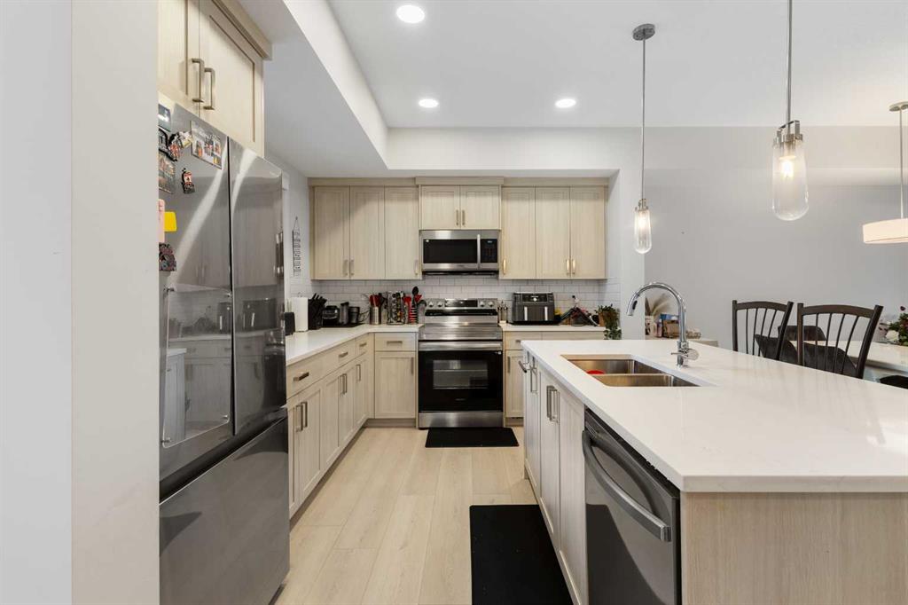 Tucked in the vibrant and family-oriented community of Seton in Southeast Calgary, this beautifully appointed 3-bedroom townhome offers an ideal balance of comfort and convenience. The main floor welcomes you with a bright open-concept layout, with an elegant kitchen featuring stylish and full height cabinetry, stainless steel appliances, modern countertops, and a tasteful backsplash. The extensive island transitions into a large dining room and a spacious living area, while a large south-facing window fills the space with natural sunlight throughout the day. Enjoy the peaceful view of the community from a 12’ by 6’ balcony. Just perfect for your relaxation and entertainment! Also on this floor, a bonus den/home office provides the perfect space for working from home or for extra family needs. Upstairs, the primary suite features a sizeable walk-in closet, a lush ensuite with a standing shower and double vanity. Two additional bedrooms (perfect for kids and guests), a 4-piece main bath, and a roomy laundry area adds convenience for family living. Park your car in the safe double side by side garage, put on your walking shoes and step out to have a feel of the bespoke amenities and beautiful views outside your front door. Perfectly situated near the South Health Campus Hospital, top-rated schools, shopping, restaurants, and parks, this pet friendly complex offers the ideal balance of comfort, convenience and serenity. You’ll feel right at home in this spacious 1,814.96 Sq ft town home.