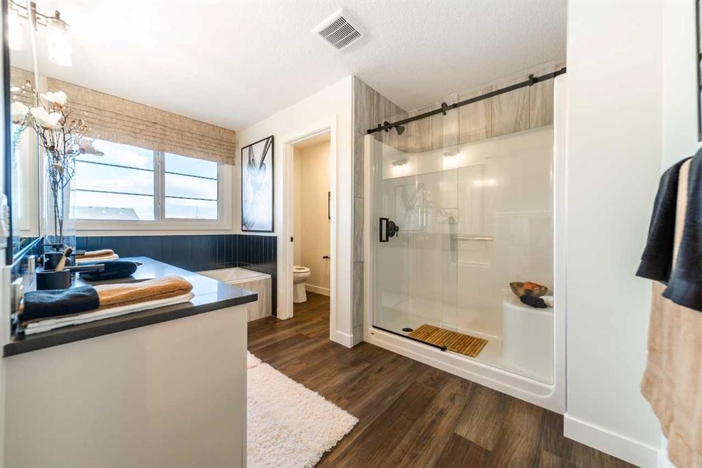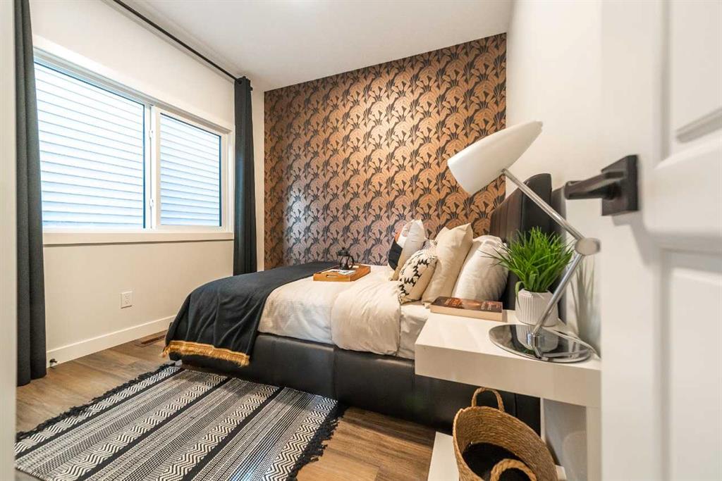 This home features an executive kitchen with built-in stainless steel appliances, gas cooktop, chimney hood fan, waterfall island and a walk-in pantry. The main floor offers a spacious flex room, and the basement has 9′ ceilings with a private side entrance. Upstairs, enjoy a vaulted bonus room, upper floor laundry, and a luxurious 5-piece ensuite with soaker tub, dual sinks, quartz counters, and a walk-in shower with tiled walls. Thoughful touches include extra windows and paint-grade railings with iron spindles. Backing onto a peaceful pond, the rear deck with gas line rough-in is perfect for relaxing or entertaining outdoors. Photos are representative.