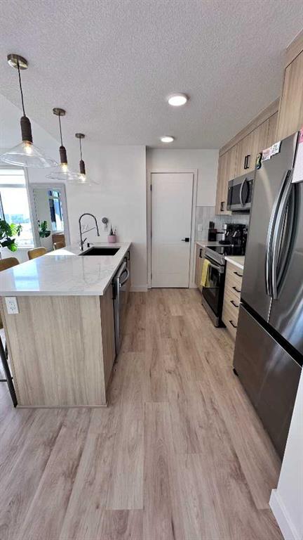 This is your opportunity to own 1 year old end unit with central AC, finished double garage with epoxy flooring, full gym and a sauna, 2 balconies and low strata fees ($231). Seton is a vibrant, master-planned community known for its modern amenities, healthcare facilities, retail options, and recreational spaces, making it a desirable place for both living and working. Main floor features open layout that connects kitchen, dining and living space. The kitchen features: quartz counters, stainlesteal appliances, beautiful cabinetry, large eating island, storage space. The main floor is completed with additional windows on the end unit, as well as a balcony. Upstairs has 3 bedrooms, 2 full baths, second balcony is located in primary bedroom. Laundry room is also located upstairs.This unit comes with window coverings, central water filtration system and water softener. Yes it is also pet friendly. Newly built HOA building equipped with tennis courts, pickleball courts, ice ring, basketball court and so much more will allow you and your family to relax during your leisure time.