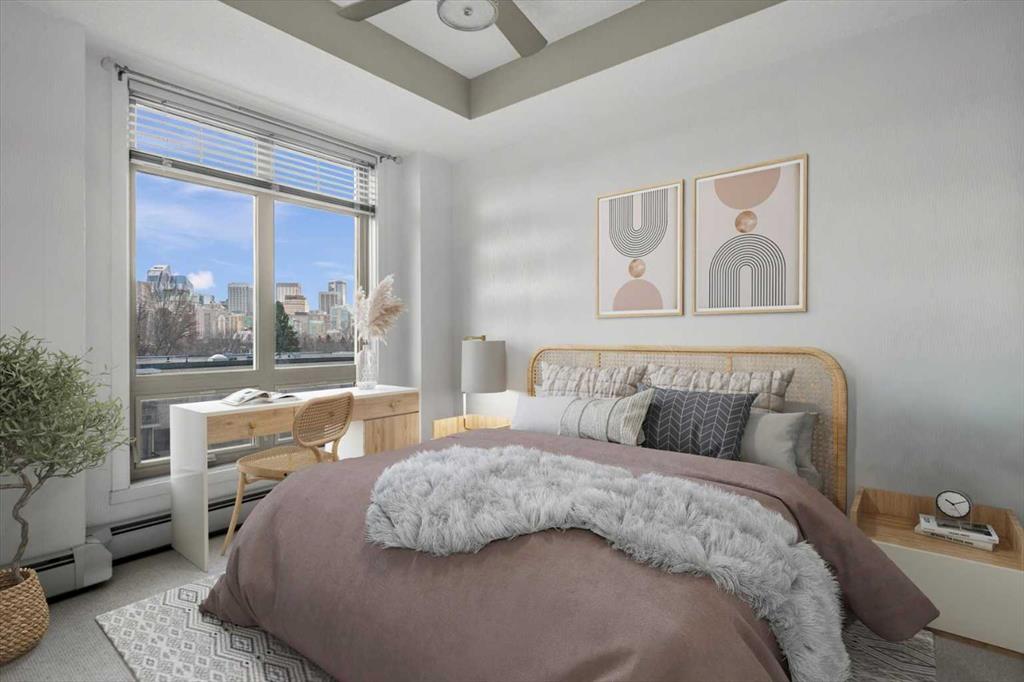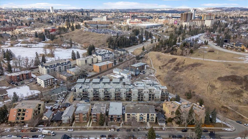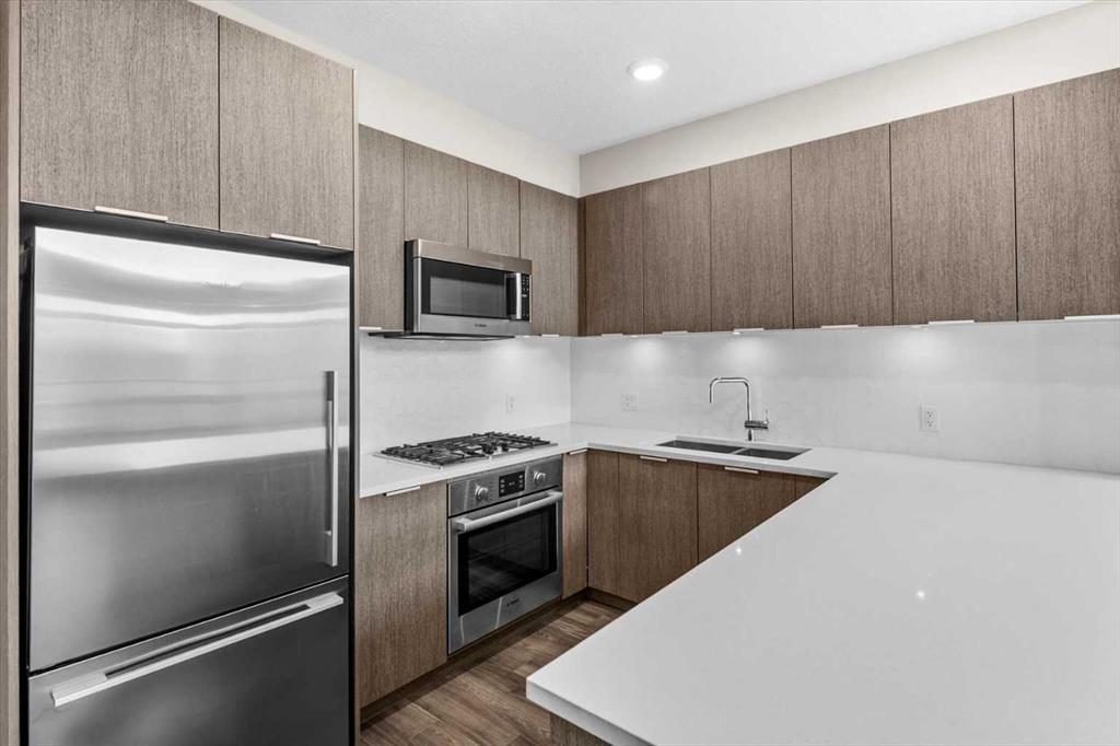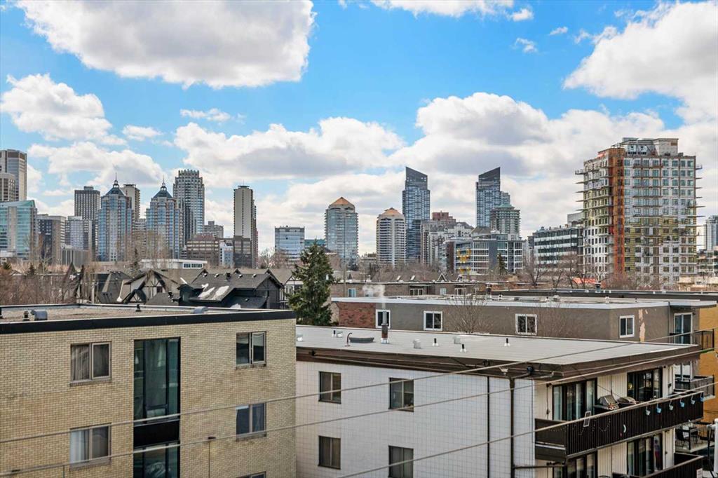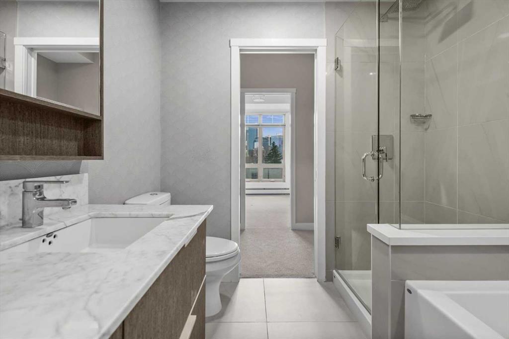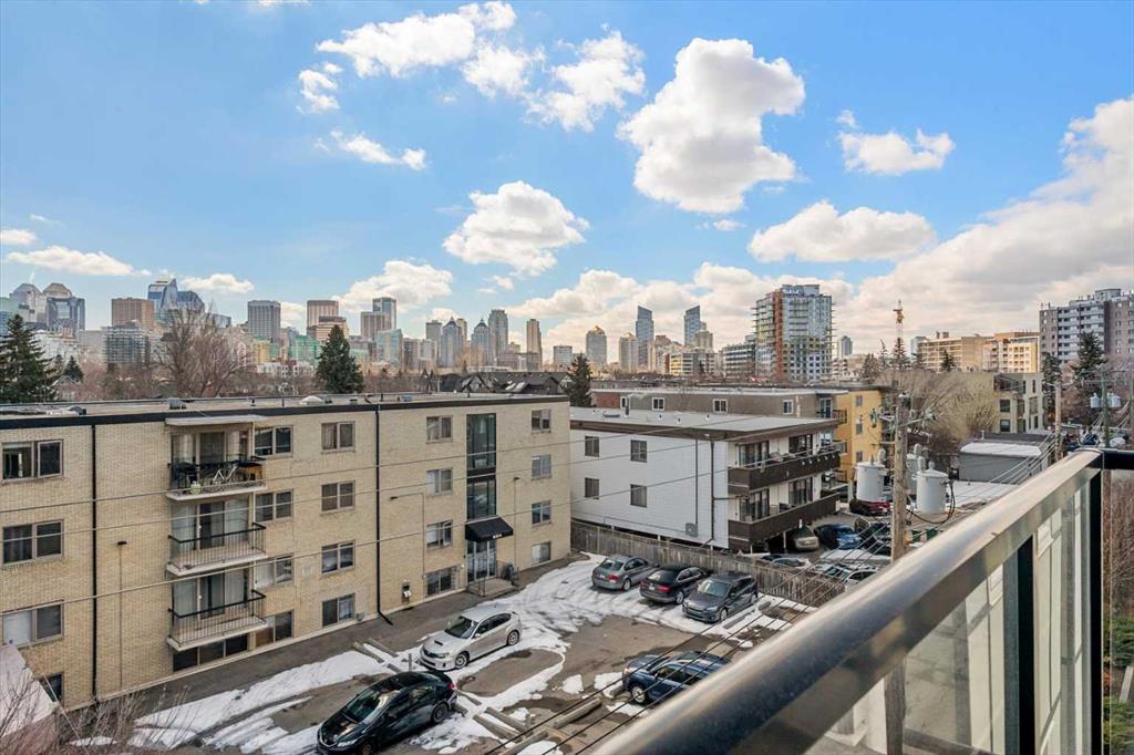 There’s a version of city living that gets talked about a lot — and then there’s the version you actually get to live. This is the latter. Perched on the top floor of The Ven with views of Calgary’s downtown skyline, this one-bedroom penthouse sits in the heart of Sunnyside, steps from Kensington and one of Calgary’s most walkable communities. Fourteen-foot vaulted ceilings, massive windows that fill the space with light, and a south-facing balcony so generous it becomes a room of its own. Inside, the open-concept living and dining area feels genuinely spacious, those soaring ceilings and oversized windows do a lot of the heavy lifting, making the space feel bright and open on a quiet weeknight and easy to have people over on the weekend. The kitchen is well set up for someone who enjoys cooking, quartz countertops, stainless steel appliances, and a gas cooktop that gives you real control. In-suite laundry means one less errand on the to-do list, and additional in-suite storage means everything has a place without giving anything up. The primary bedroom is bright and naturally lit, connecting to a four-piece ensuite through a walk-through closet, a standup shower and soaker tub that make winding down at the end of the day genuinely easy. Then there’s that balcony. South-facing, loaded with sun across all four seasons, with a gas hookup ready for the BBQ and enough room to actually use it — for morning coffee with the skyline in front of you, a summer dinner that stretches into the evening, or a quiet afternoon with a book and more sun than you expected in October. The location does what only a handful of Calgary neighbourhoods can. The Sunnyside LRT is steps away, putting downtown within a seamless commute and SAIT just up the hill, the kind of access that quietly shapes how you spend your time. Puccinella, Hayden Block, and Kensington Pub are down the street for evenings out, Kensington Wine Bar when the occasion calls for it, and High Ground Cafe or Agudo Coffee Roasters for the mornings that deserve a proper start. The Bow River pathways, Prince’s Island Park, and everything the inner city offers are all within easy reach, close enough to be part of your regular week, not just a weekend plan. The building takes care of the rest — pet-friendly with board approval, visitor parking, a car wash, bicycle storage, an assigned storage locker underground, and a small workshop tucked in for the projects that need a bit more room to breathe. This is the kind of home and the kind of address that makes the decision easy, and makes you feel good about it long after you’ve settled in.