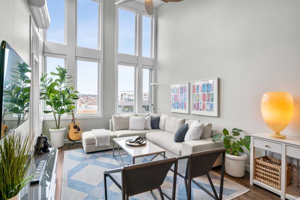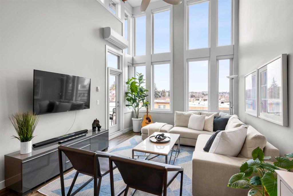 OPEN HOUSE SATURDAY MARCH 28 1-3 AND SUNDAY MARCH 29 1-3PM. Welcome to one of the most desirable residences in the building, an exceptional two-bedroom PENTHOUSE SW corner unit in Lower Mount Royal just steps from vibrant 17th Avenue. Privately positioned on the top floor, this home enjoys premium west exposure with dramatic 15+ ft vaulted ceilings and floor-to-ceiling windows that fill the space with natural light.