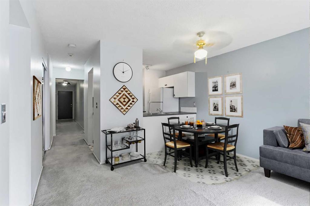 This prime Bridgeland location is blocks from the Bow River pathways, directly by Edmonton Trail, for easy access to Memorial, Deerfoot, the Downtown Core and East Village, AND with both assigned underground and loads of street parking available, enjoys all the shopping, dining and activities anyone could want or need! With Walk and Bike scores between 96 and 99, Transit nearby, and being the TOP floor of a Low-Rise 47 Unit apartment, life at Waterford is beautiful. This 723.32 square foot open concept apartment includes virtually staged photos for the listing, iGuide 3D tour, detailed floor plans, and offers its new owner thick plushy carpet in great shape, and easy-to-care for lino that can be updated with vinyl easily if desired. The plan is flexibly open, bright, includes TWO Bedrooms (the Primary is 12.25′ wide, easily holds a king!) with large windows, and is listed for an incredible value price – the affordability cannot be beaten, and this home will not last long! 408 647 1 Avenue NE faces East, with a 12.75′ x 6′ Balcony for sunrises and morning coffees, plus comfortable temperatures inside while remaining naturally light. The large Storage and Laundry Room can double as a combination Pantry to the contemporary-white Kitchen, complete with a nice eating bar overlooking the Dining and Living Room combination. There is a washing machine included in the appliances, and carpets have been professionally cleaned with enviro-safe products prior to listing. Documents are available in supplements for agents, or upon request for previewing. The very secure building has fob access for BOTH security entry doors, a large welcoming Entry and lots of seating, additional fob security required to access the Parkade level, interior mail and package delivery, 1 hour parking for visitors, and street parking behind the building – so many conveniences! Management is responsive, and the building receives regular attention and maintenance. Looking forward to a quick purchase before the holiday enjoyments!