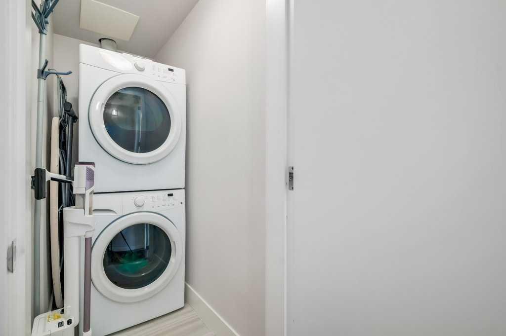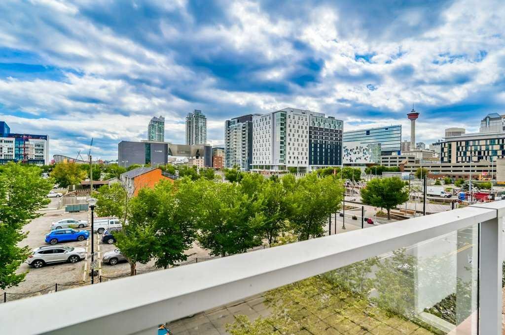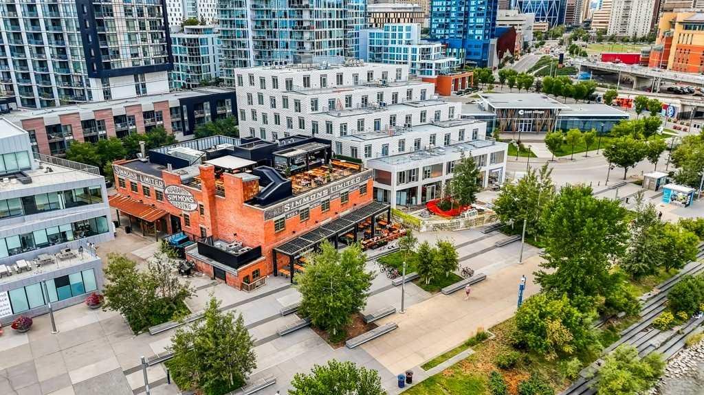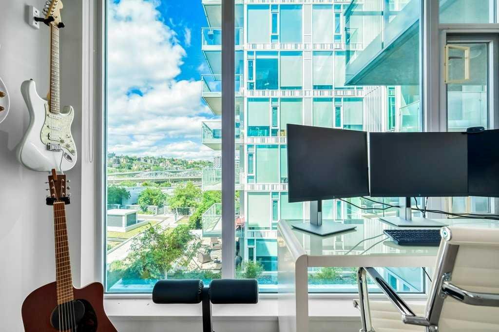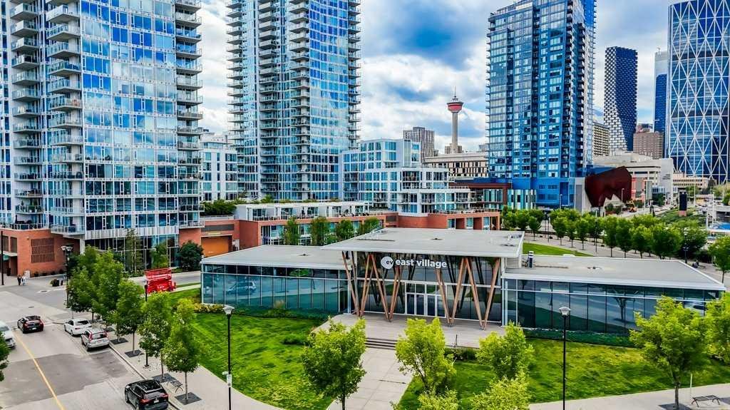Welcome to Evolution in Calgary’s Vibrant East Village – where contemporary design meets urban convenience. This stunning two-bedroom, two-bathroom residence offers 872 square feet of thoughtfully designed living space in one of the city’s most dynamic and fast-growing communities. From the moment you step inside, you’re greeted by a bright, open-concept floor plan that blends the living room, dining area, and kitchen into one seamless, light-filled space. A wall of floor-to-ceiling windows floods the interior with natural light, creating a warm and inviting atmosphere while showcasing the city’s energy and charm. The chef-inspired kitchen is both stylish and functional, featuring sleek, modern cabinetry, elegant quartz countertops with matching backsplash, a convenient breakfast bar, and premium stainless steel appliances—including a gas range for the home cook who values performance. Under-cabinet lighting enhances the workspace and adds a sophisticated touch. The primary bedroom is generously sized to comfortably accommodate a king bed, and features his-and-hers closets that provide excellent storage. The spa-like five-piece ensuite is a true retreat, complete with double vanities, deep soaking tub, separate glass-enclosed shower, and heated tile floors for year-round comfort. The second bedroom has river views—perfect for guests, a home office, or both—is located on the opposite side of the unit for optimal privacy, with its own beautifully appointed full bathroom nearby. Both bathrooms feature high-quality finishes and a modern aesthetic consistent with the rest of the home. Step outside to the oversized covered balcony—complete with power and a gas line for your BBQ—perfect for outdoor cooking and relaxing year-round. Additional highlights include full-size in-suite laundry, a titled underground parking stall, and a separate secure storage locker for seasonal or bulky items. Residents enjoy impressive building amenities including 24-hour concierge, a state-of-the-art fitness centre with gym, steam room, and sauna, expansive private landscaped gardens, a stylish social lounge, visitor parking, and secure bike storage. All of this is set in the heart of the East Village, one of Calgary’s most exciting and walkable neighborhoods. You’ll be just steps away from the Bow River pathways, local cafés, eclectic dining, entertainment venues, and cultural attractions. With easy access to transit and major routes, the entire city is within reach. This home offers the perfect blend of luxury, location, and lifestyle—ideal for those seeking a modern downtown living experience without compromise. Book your private showing today and come on Buy!